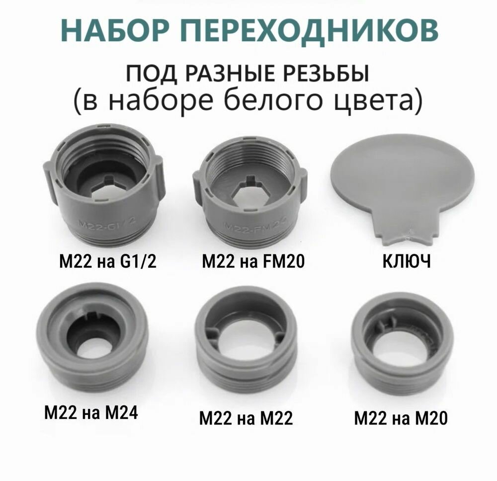 - Три типа резьбовых адаптеров в комплекте: M22×1, M24×1, G3/8