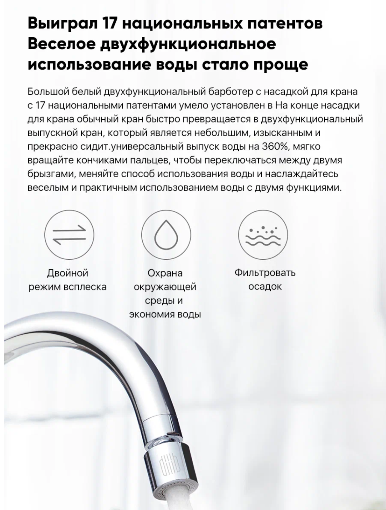- Устраняет брызги при мытье высоких кастрюль (угол отклонения до 30°)
