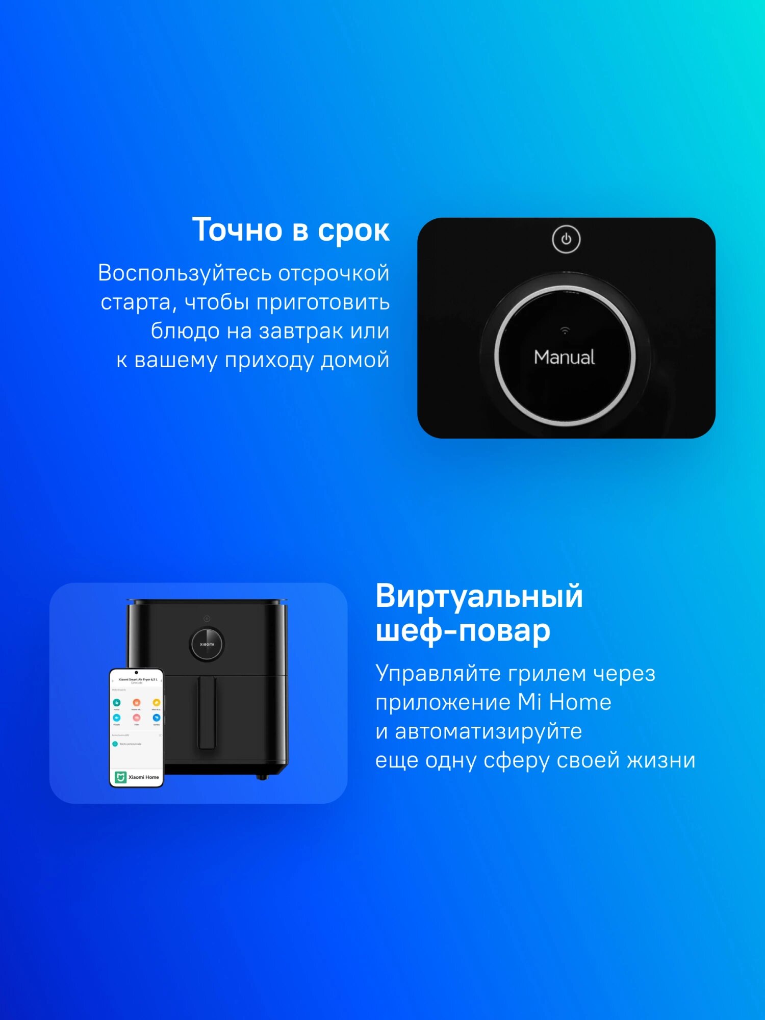 Функция отсрочки старта до 24 часов синхронизируется с мобильным приложением Mi Home. Электронный таймер поддерживает 9 автоматических программ: выпечка (180°C), стейк (200°C), морепродукты (160°C). При ошибке выбора режима система корректирует температуру на основе данных датчиков.
