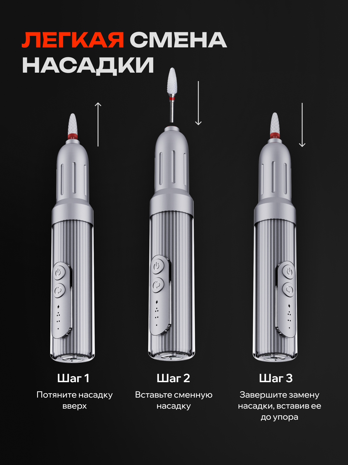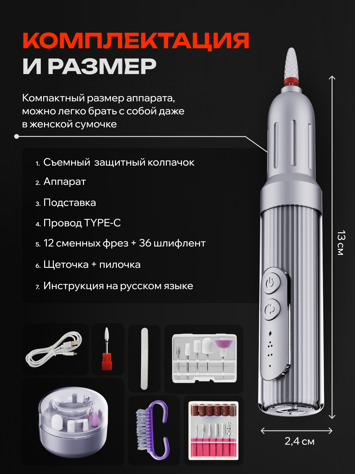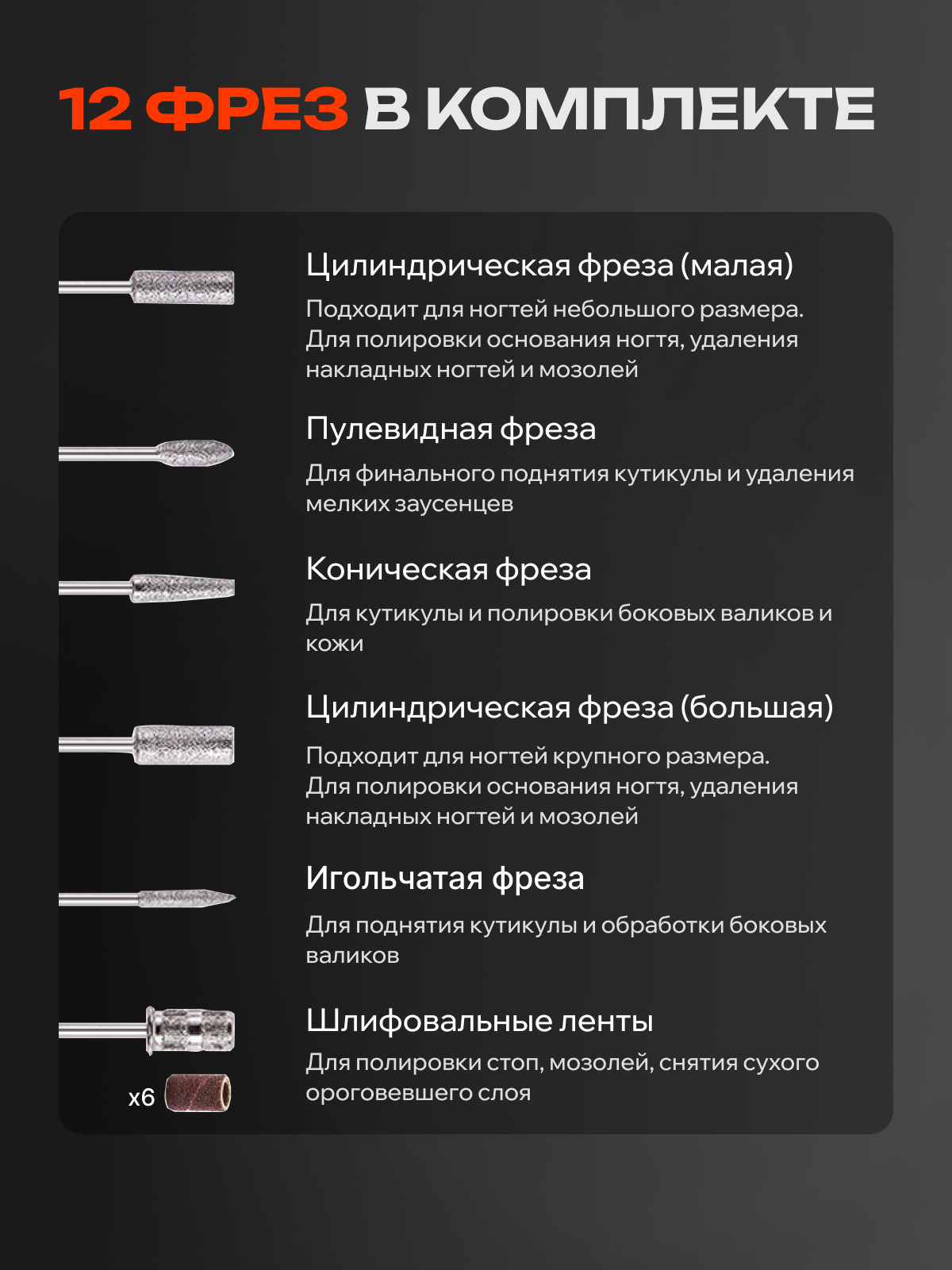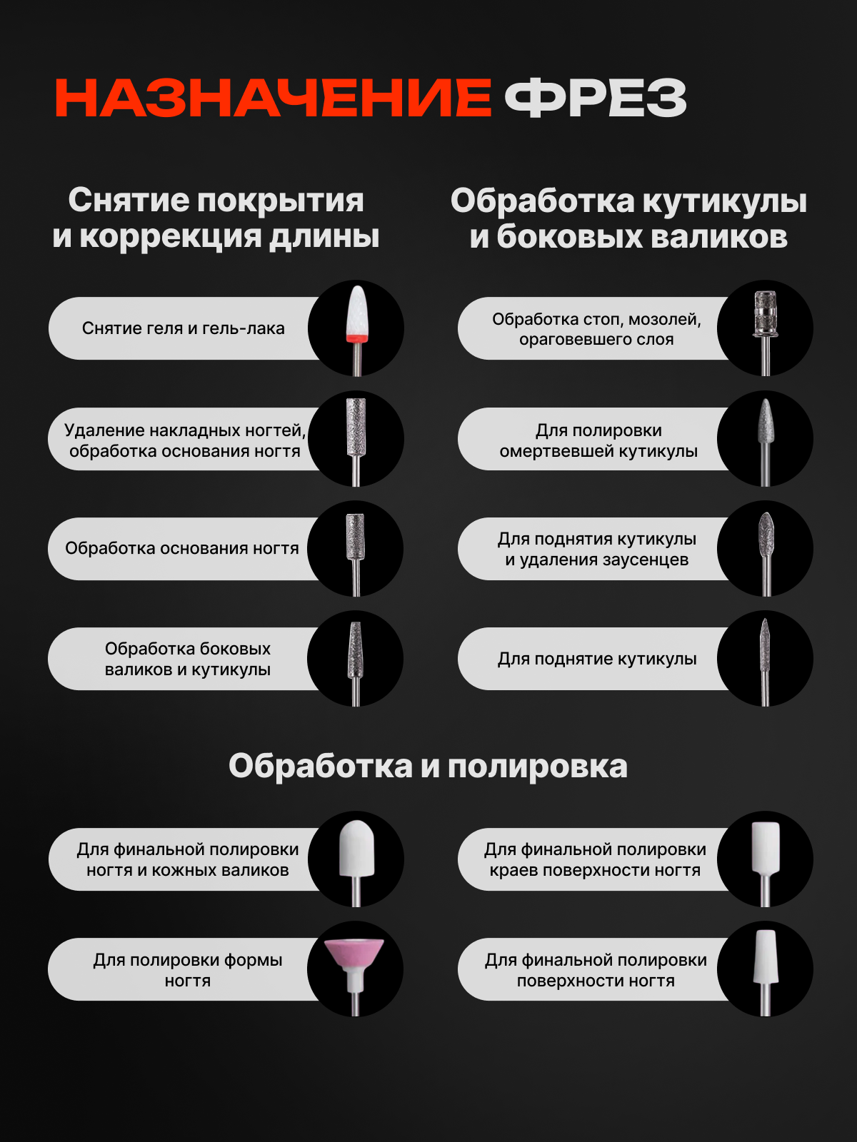 - 15 профессиональных фрез: 5 керамических (конус, пуля, цилиндр), 3 алмазных (игла, шар, пламя), 4 металлических (сверло, фреза для кутикулы), 3 полировочные головки