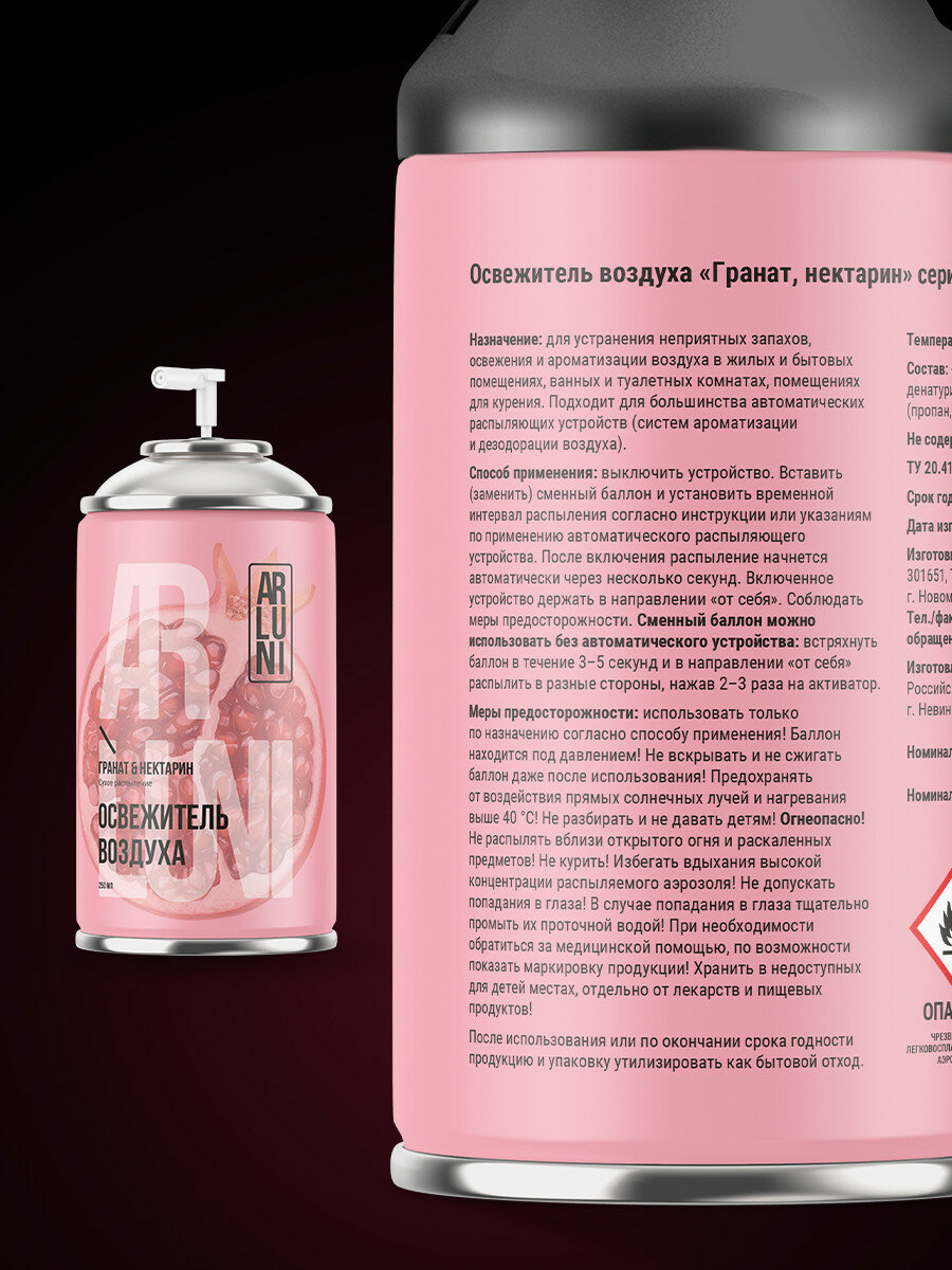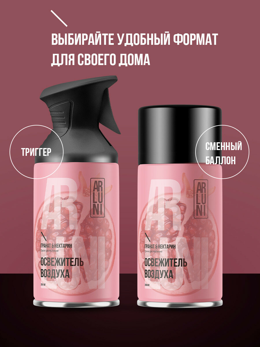 Сменный аэрозольный баллон Arluni объёмом 250 мл использует технологию сухого распыления, которая предотвращает оседание капель на поверхностях. Принцип ручного распыления позволяет: