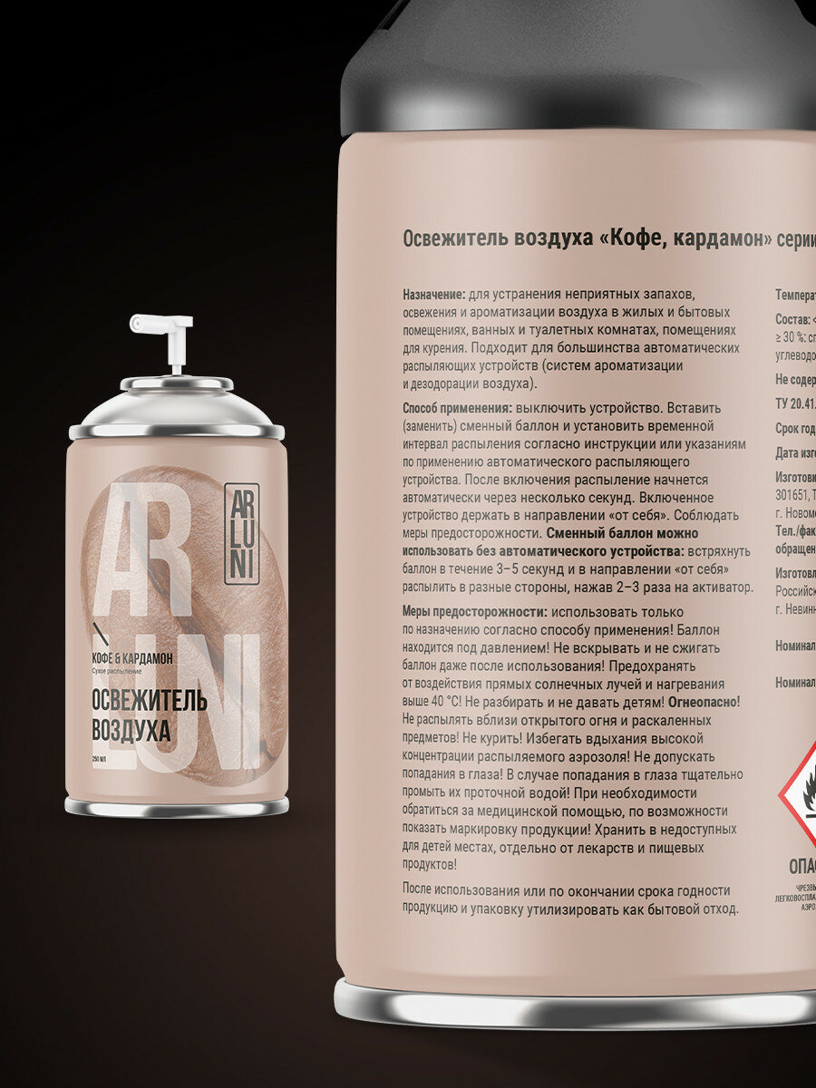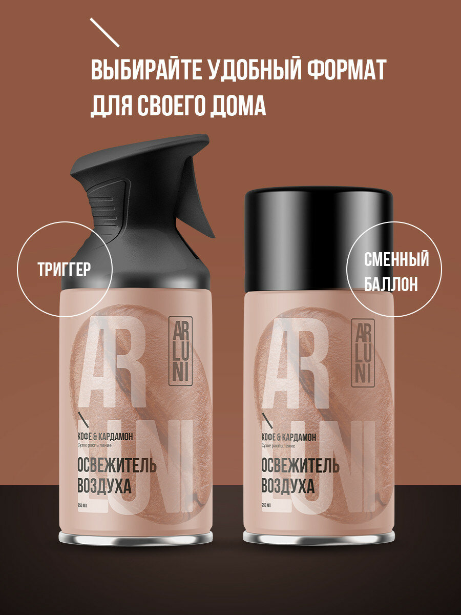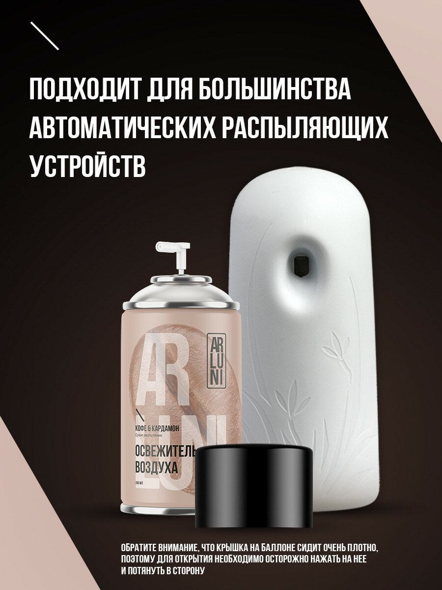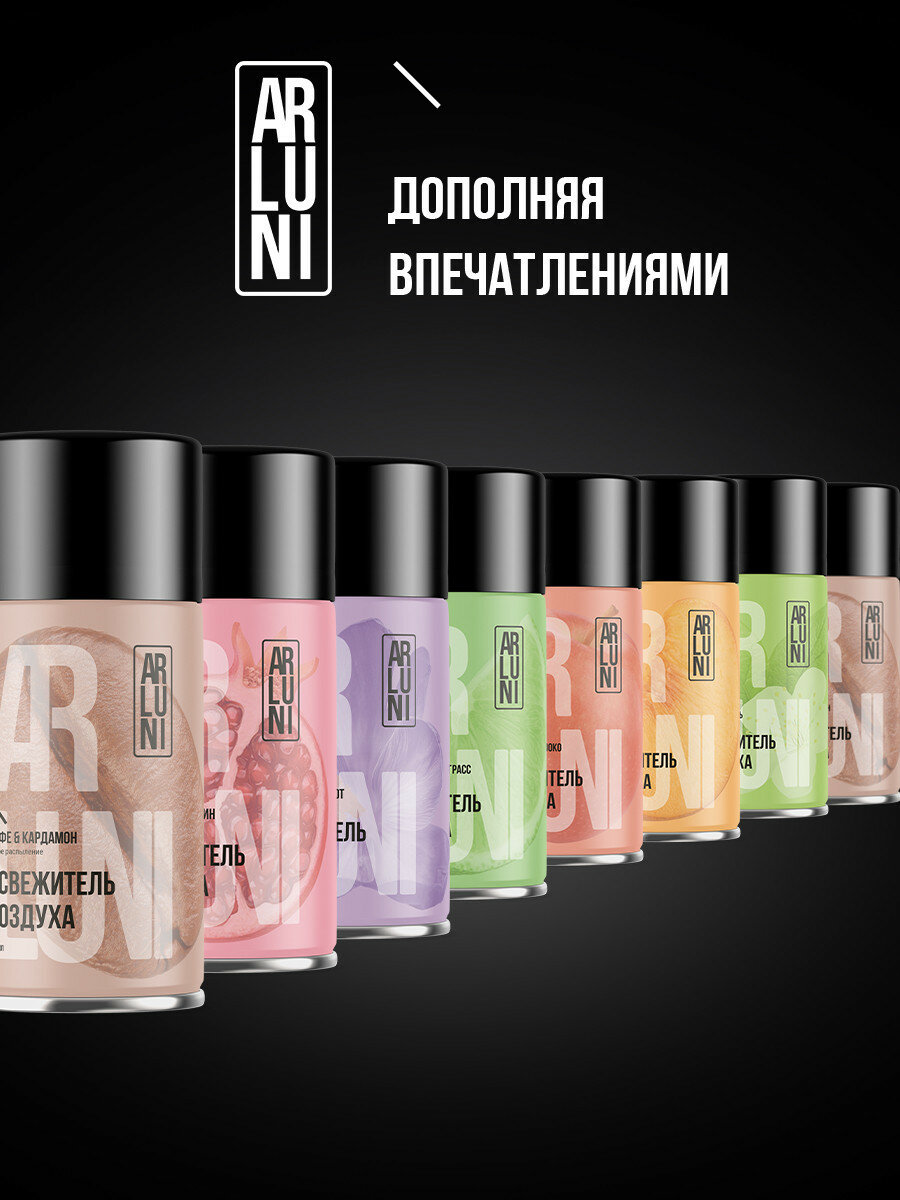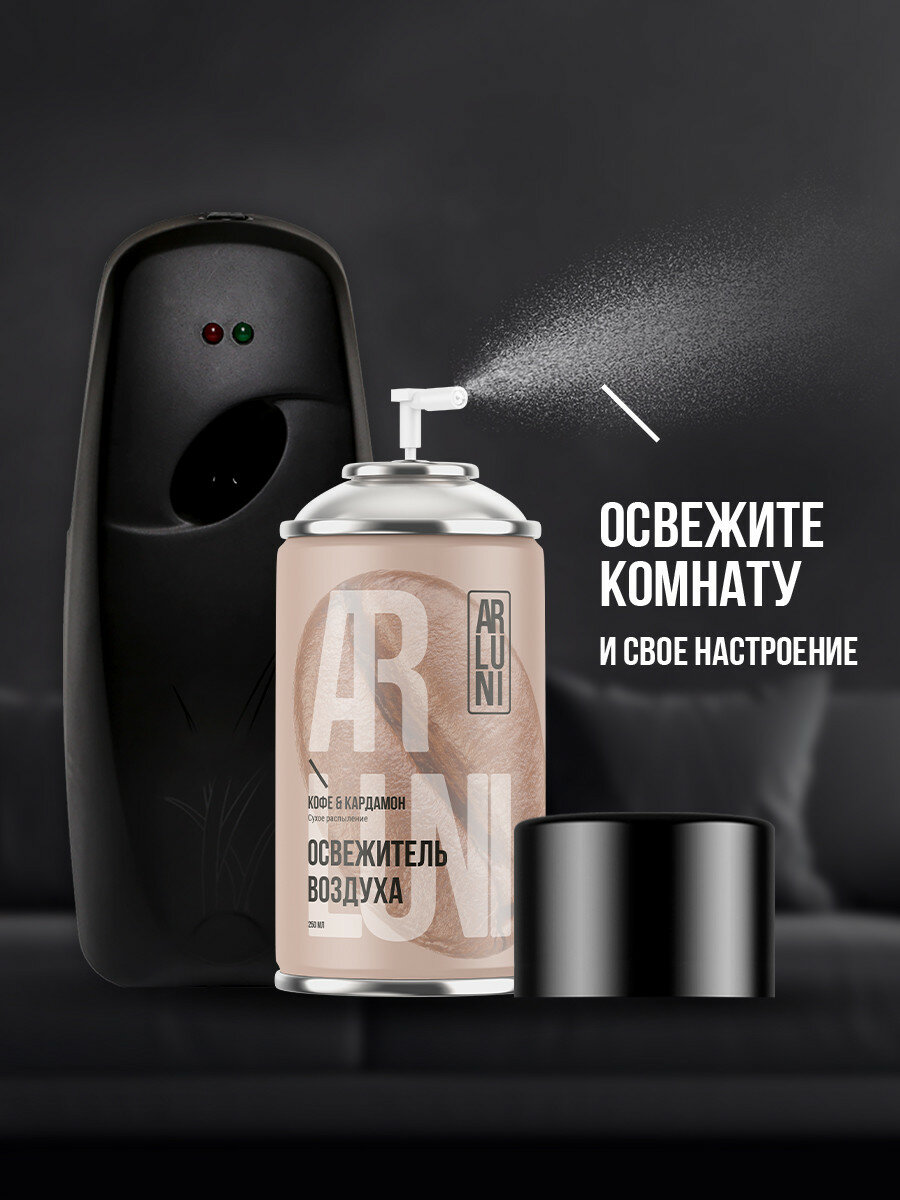 Освежитель воздуха Arluni ручного распыления сочетает быстрое воздействие и точный контроль расхода. В отличие от гелевых аналогов, аэрозольный баллон позволяет: