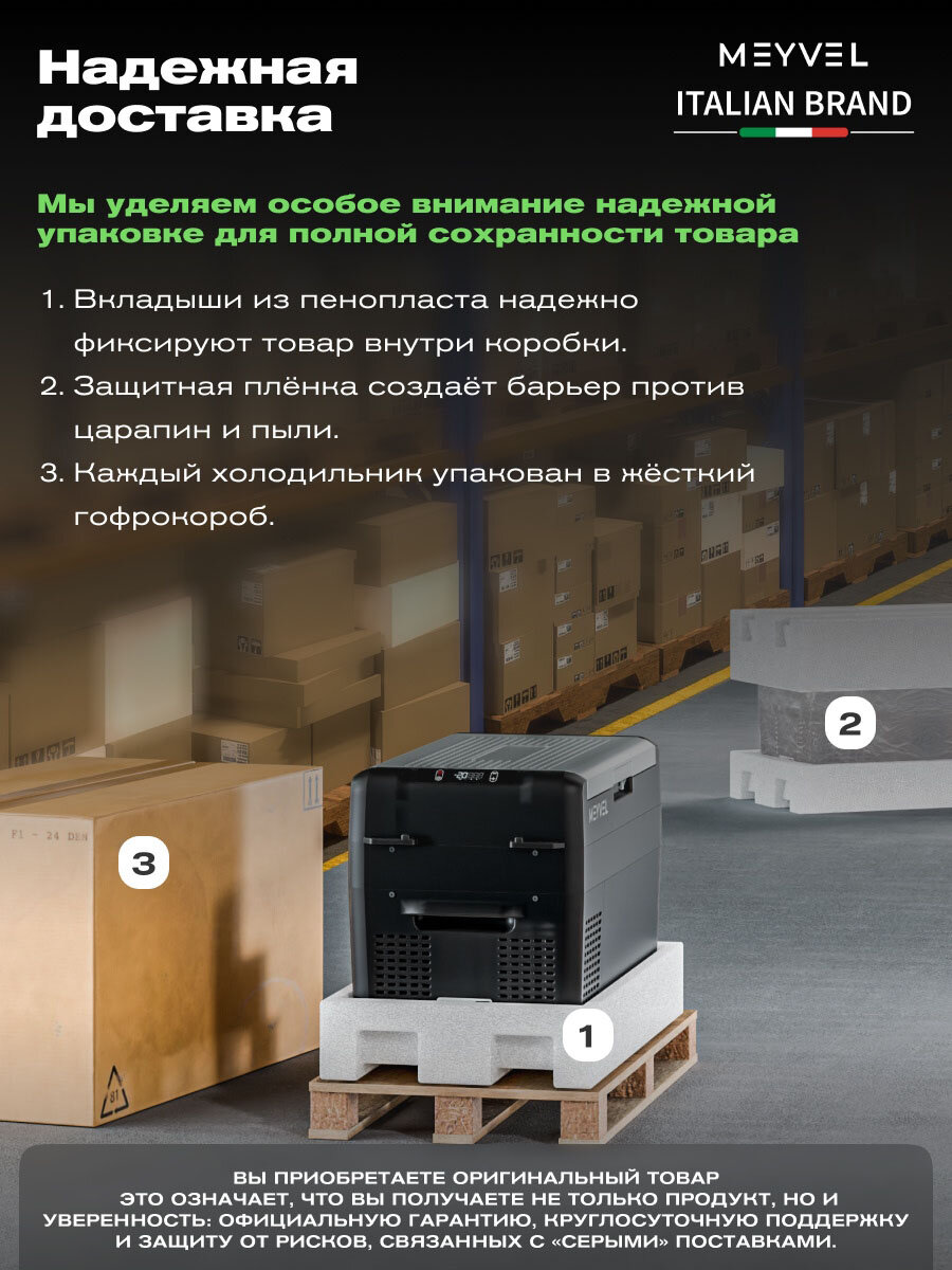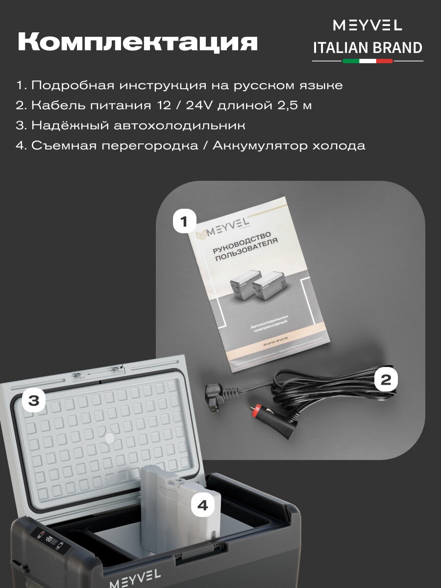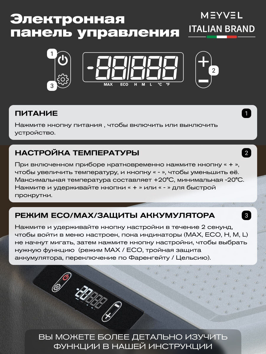 Автохолодильник Meyvel AF-L20 Ice использует компрессор закрытого типа для стабильного поддержания температуры до -20°C в любых условиях. В отличие от термоэлектрических моделей, компрессорный принцип обеспечивает: