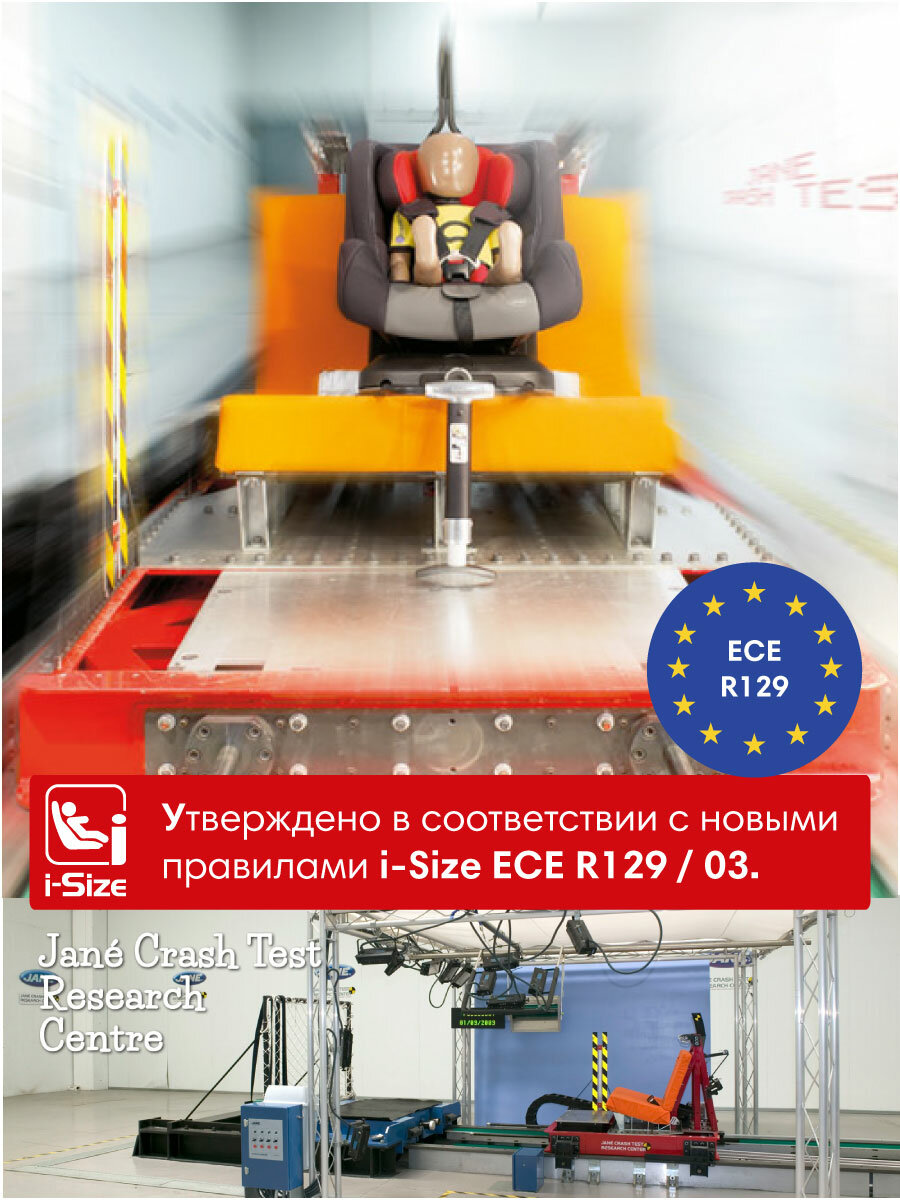 - Стандарт ECE R129 (i-Size) обеспечивает усиленную защиту головы при боковых ударах за счет глубоких энергопогашающих подушек по бокам подголовника.