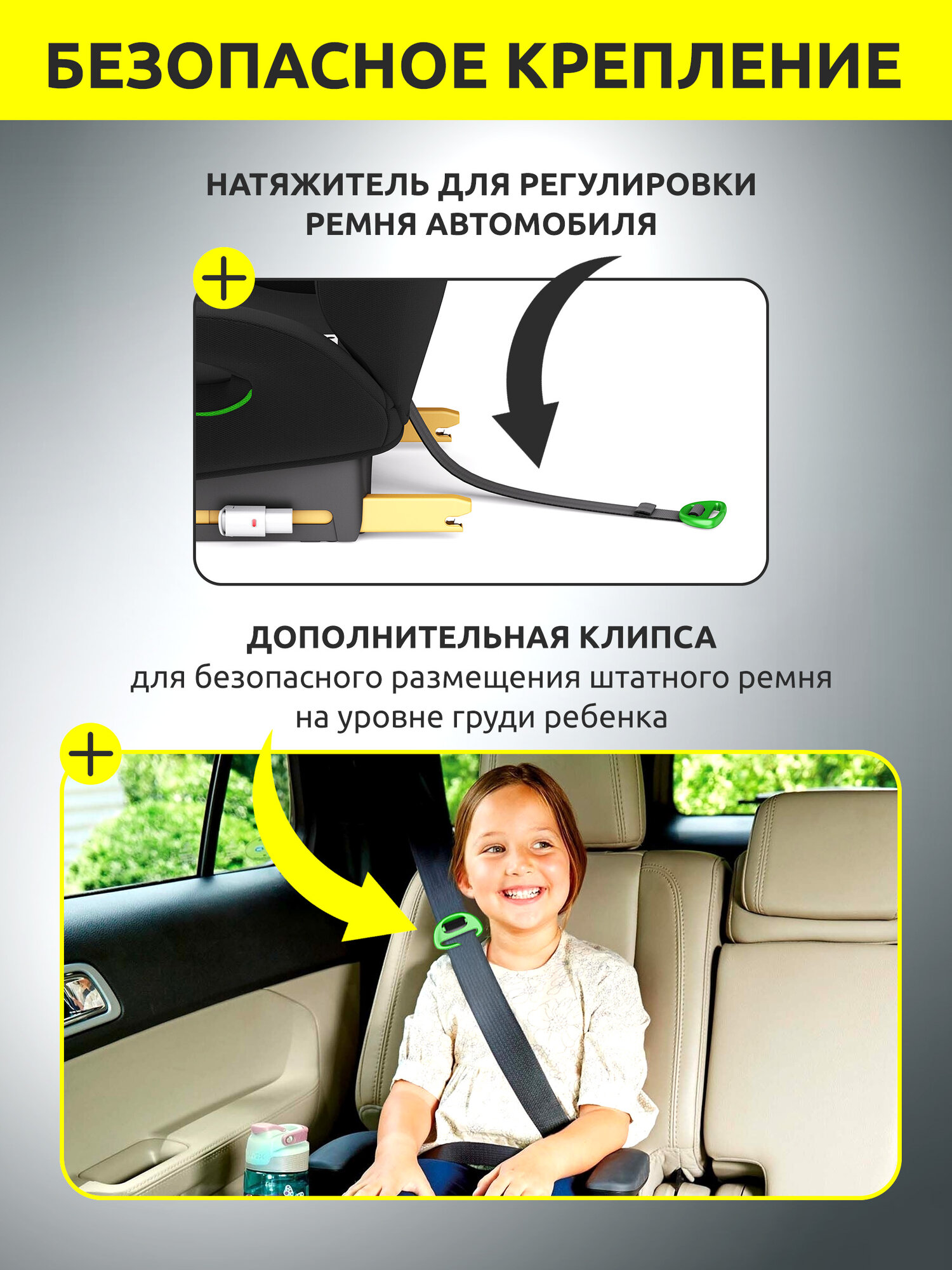 - Фиксатор натяжения ремня: специальный зажим предотвращает проскальзывание штатного ремня при резком торможении