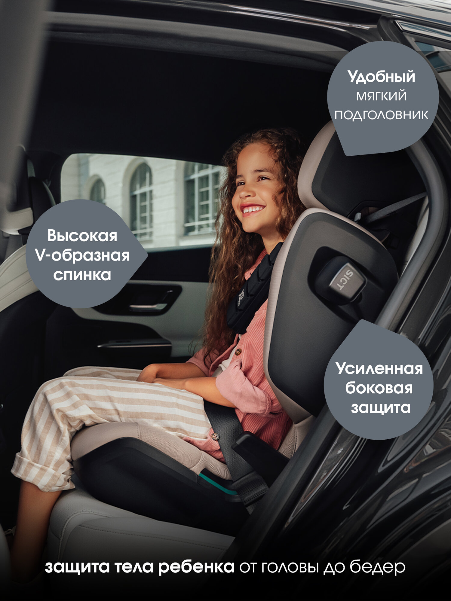 - Весовая группа: 15-36 кг (группа 2/3) при росте ребенка 100-150 см