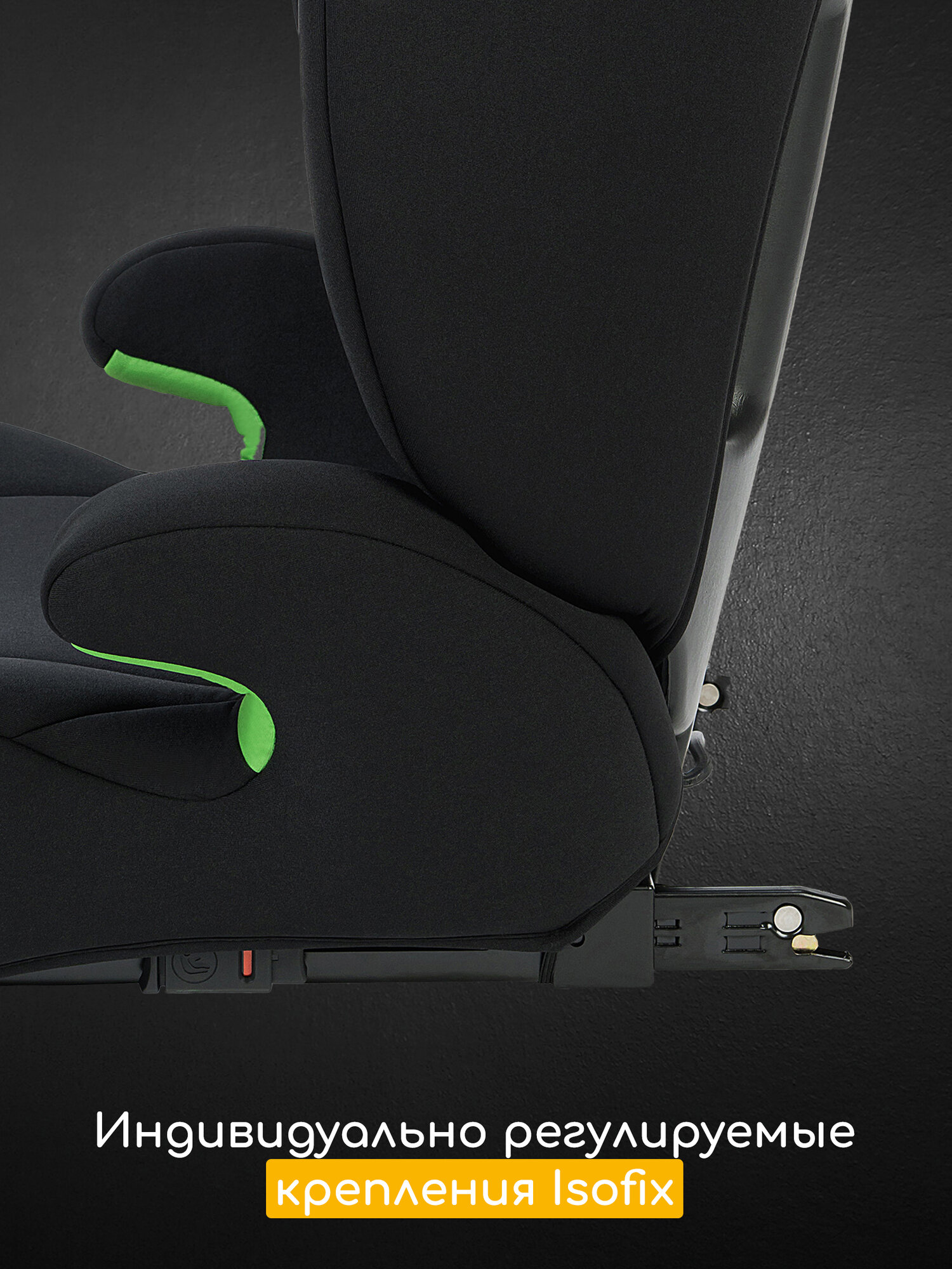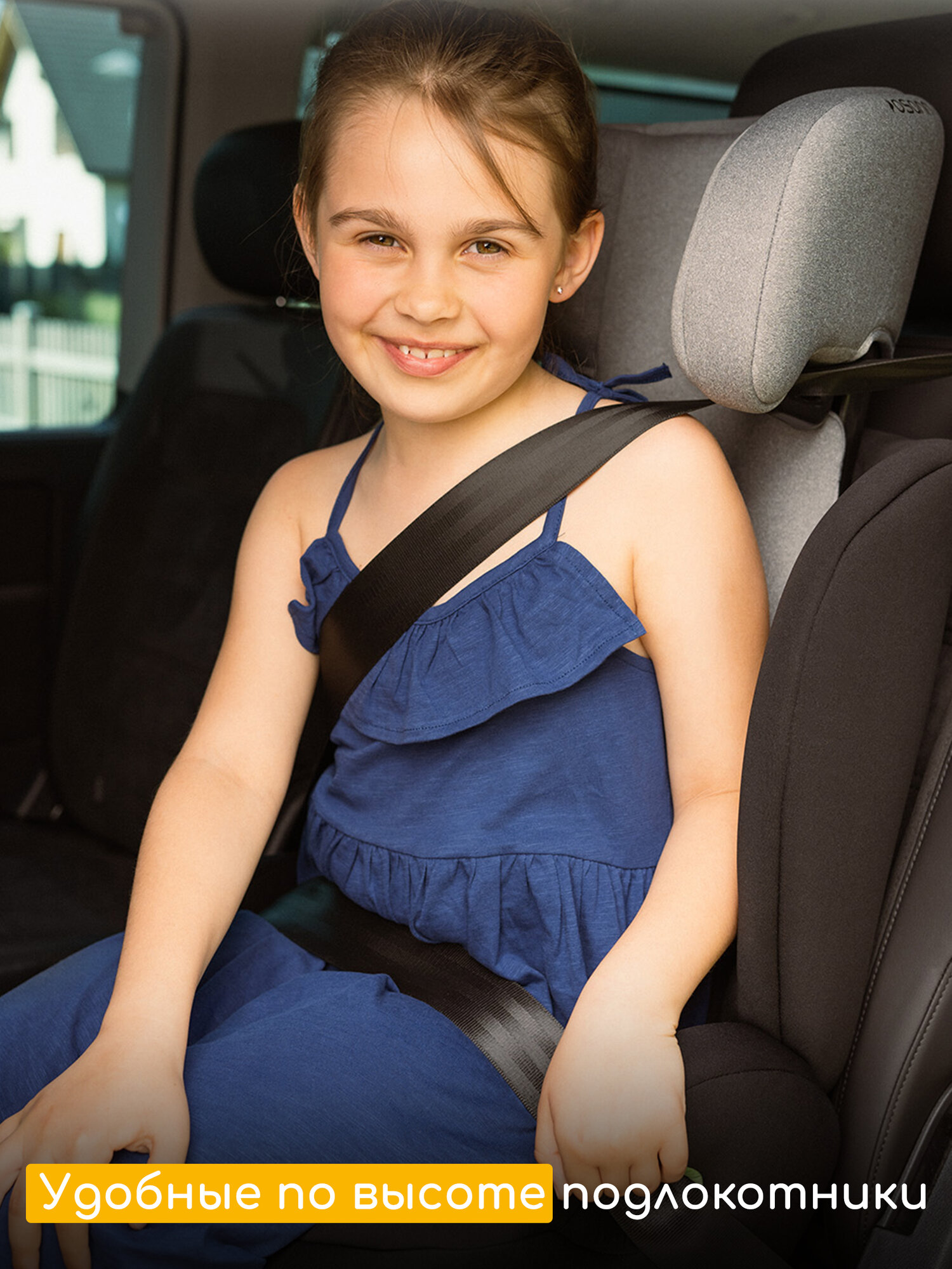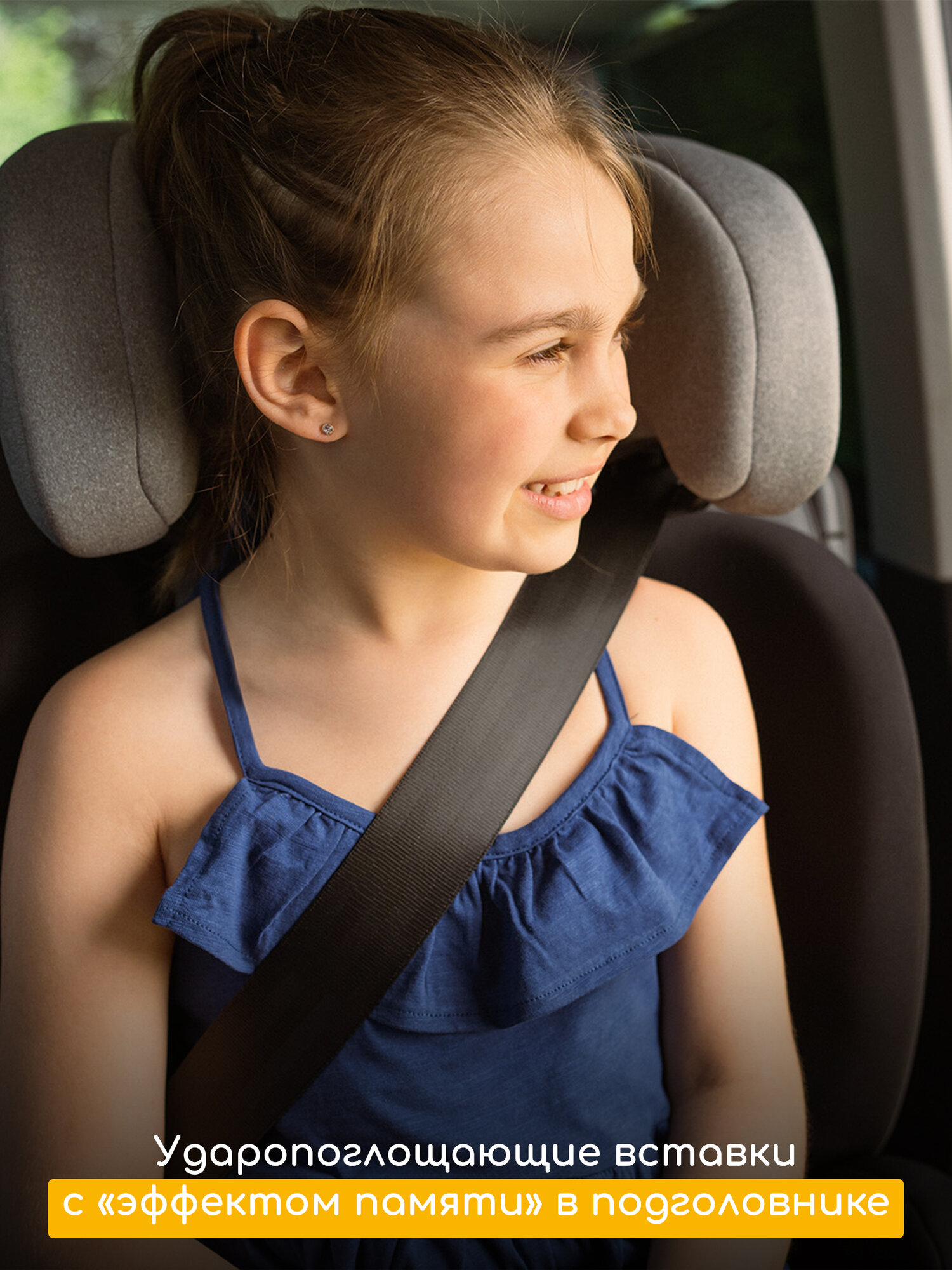 Регулировка подголовника в 2 положениях поддерживает голову ребенка при изменении положения сиденья. Анатомическая спинка с воздухопроницаемыми вставками предотвращает перегрев. Технические характеристики: