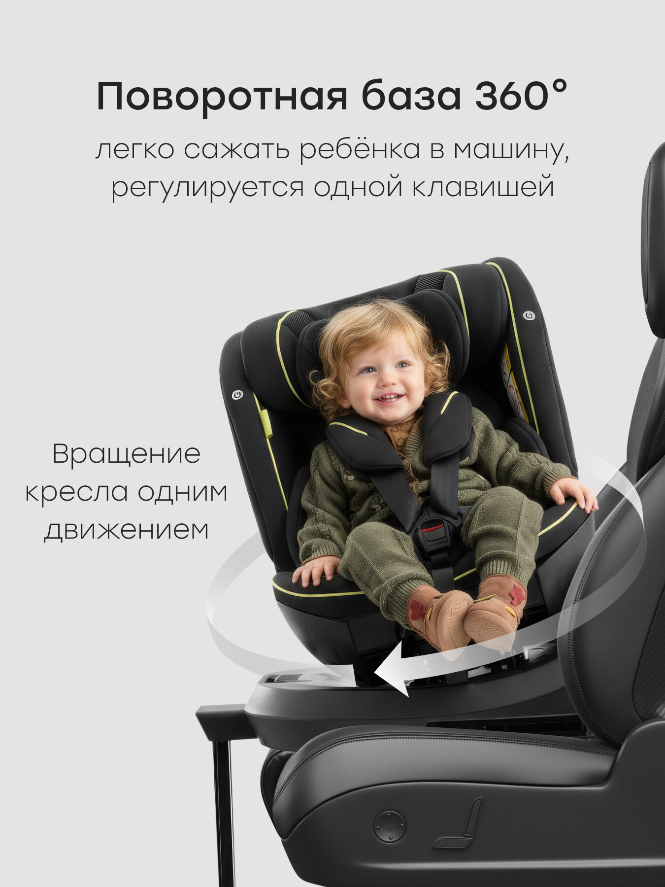 Поворотный механизм на 360° решает проблему неудобной фиксации ребенка в запертом пространстве. В отличие от классических моделей Cybex Sirona с углом вращения 180°, наша система позволяет свободно разворачивать кресло к двери при посадке.