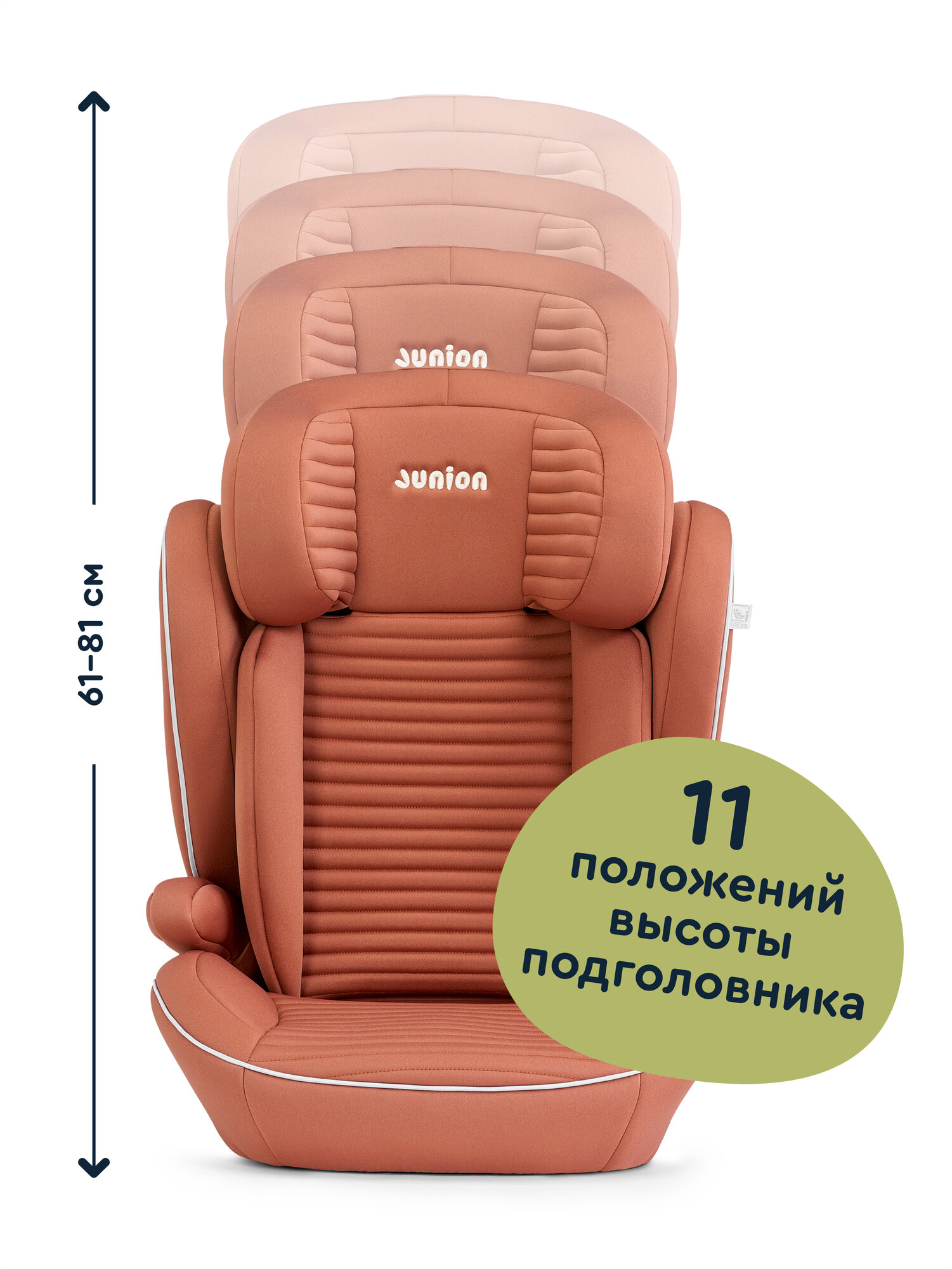 Автокресло Junion Theo i-Size группы 2/3 (15-36 кг) рассчитано на детей ростом 100-150 см. Конструкция разрешает переход в режим бустера после удаления спинки по схеме: