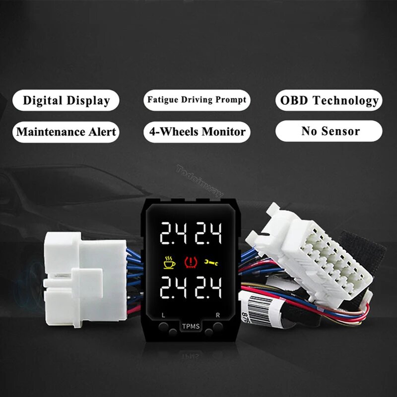 OBD TPMS система для Toyota решает проблему постоянного контроля давления в шинах при смене сезонной резины. В отличие от стандартных комплектов с внешним дисплеем, наш комплект использует диагностический разъем OBD-II для вывода данных напрямую на панель приборов. Это обеспечивает: