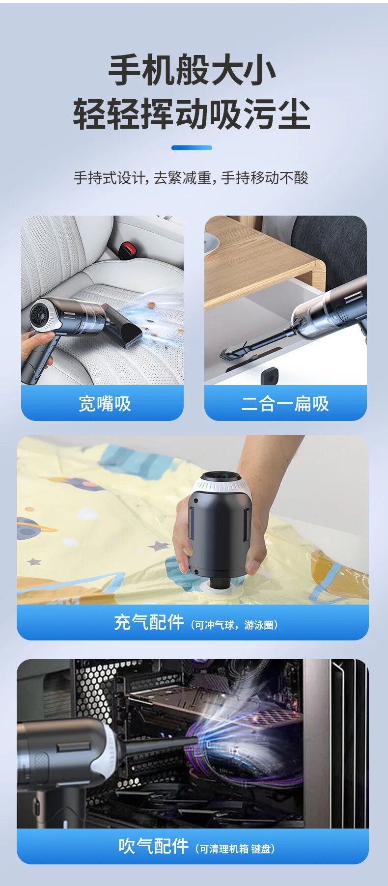 Устройство поддерживает аксессуары экосистемы Xiaomi Youpin: многофункциональные насадки для влажной уборки и специальные щётки для чистки компьютерной техники. В автомобиле возможна установка в 3 позициях: