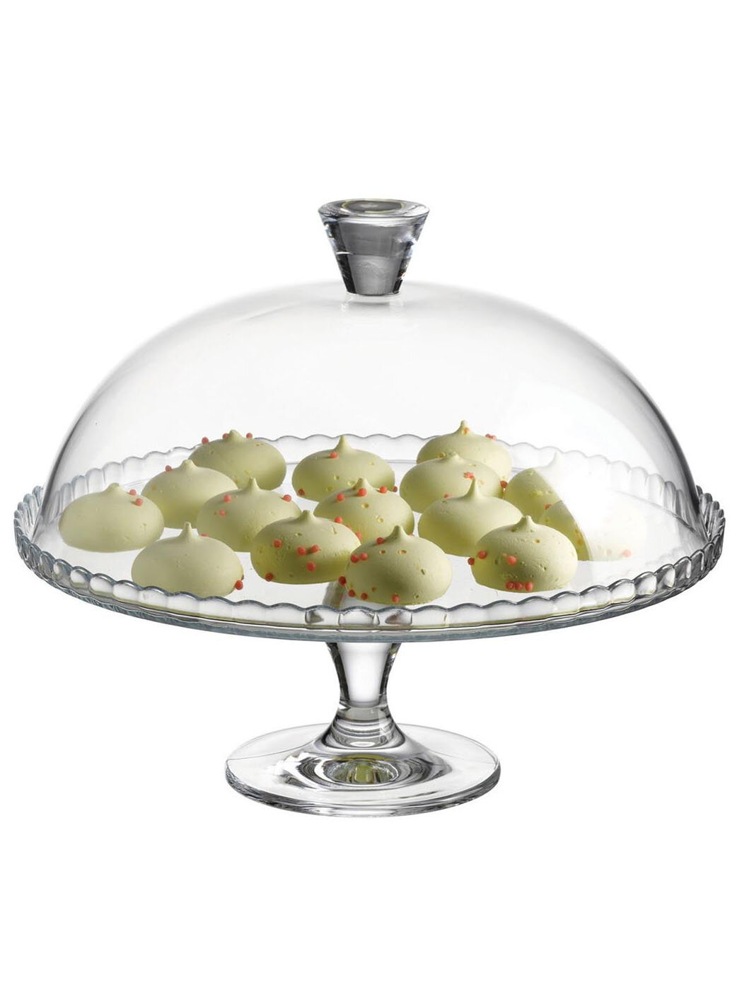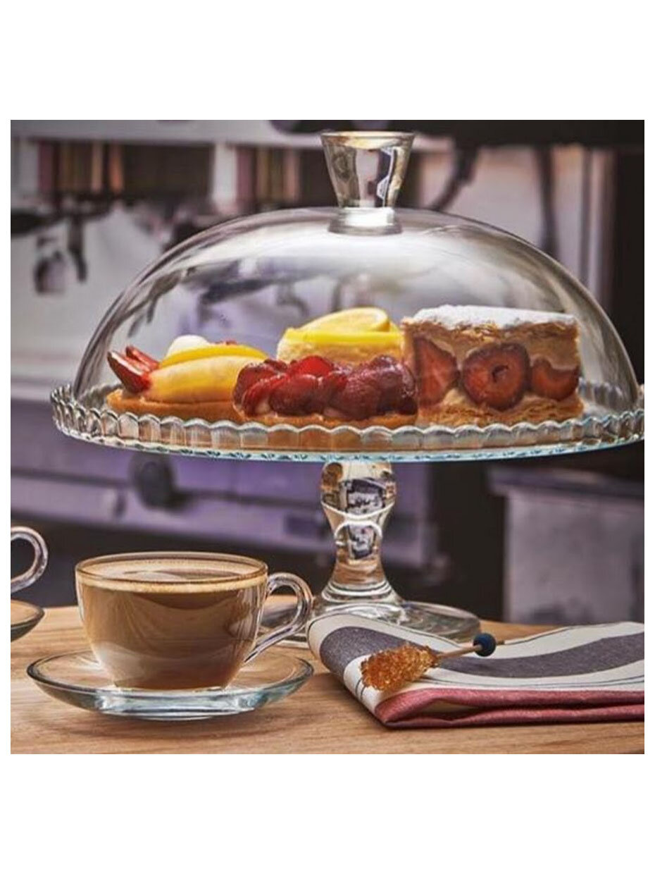 Тортовница занимает 17×17 см в разобранном виде. 3D-визуализация от дизайнеров KüchenPro: подходит для вертикального размещения на полках глубиной от 20 см. Силиконовые протекторы на ножке предотвращают царапины стеклянных поверхностей при хранении.
