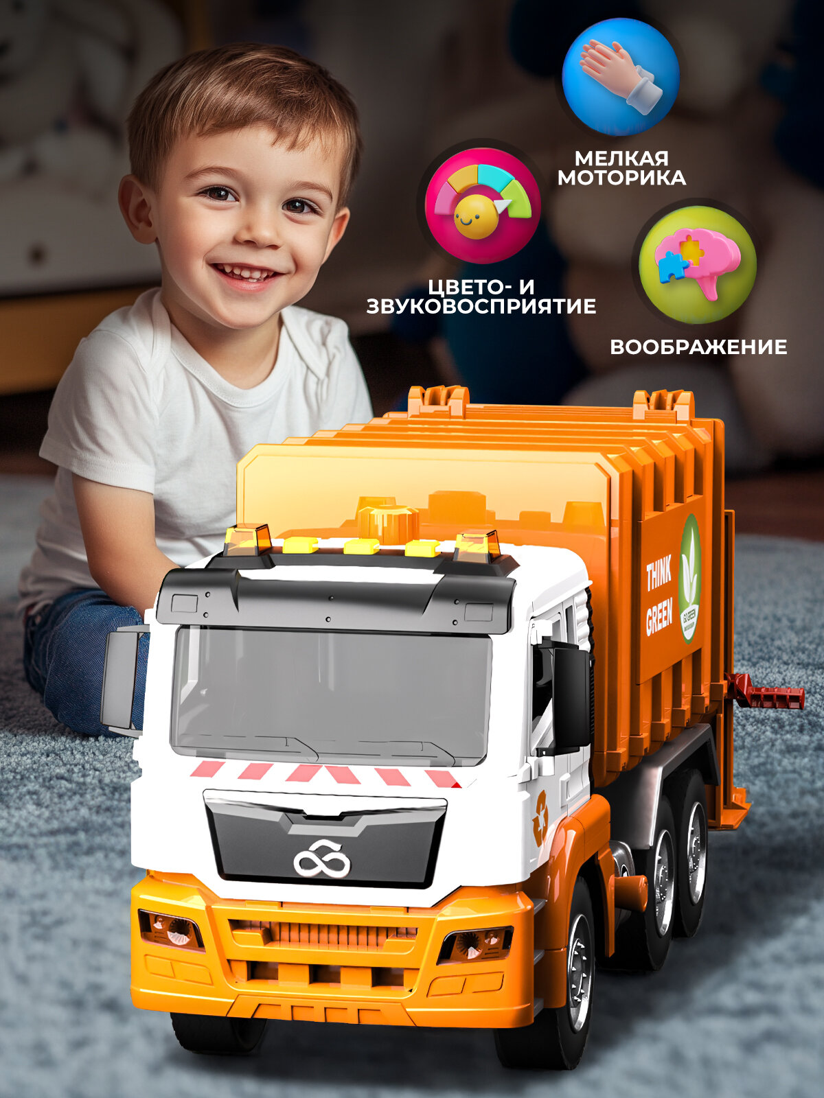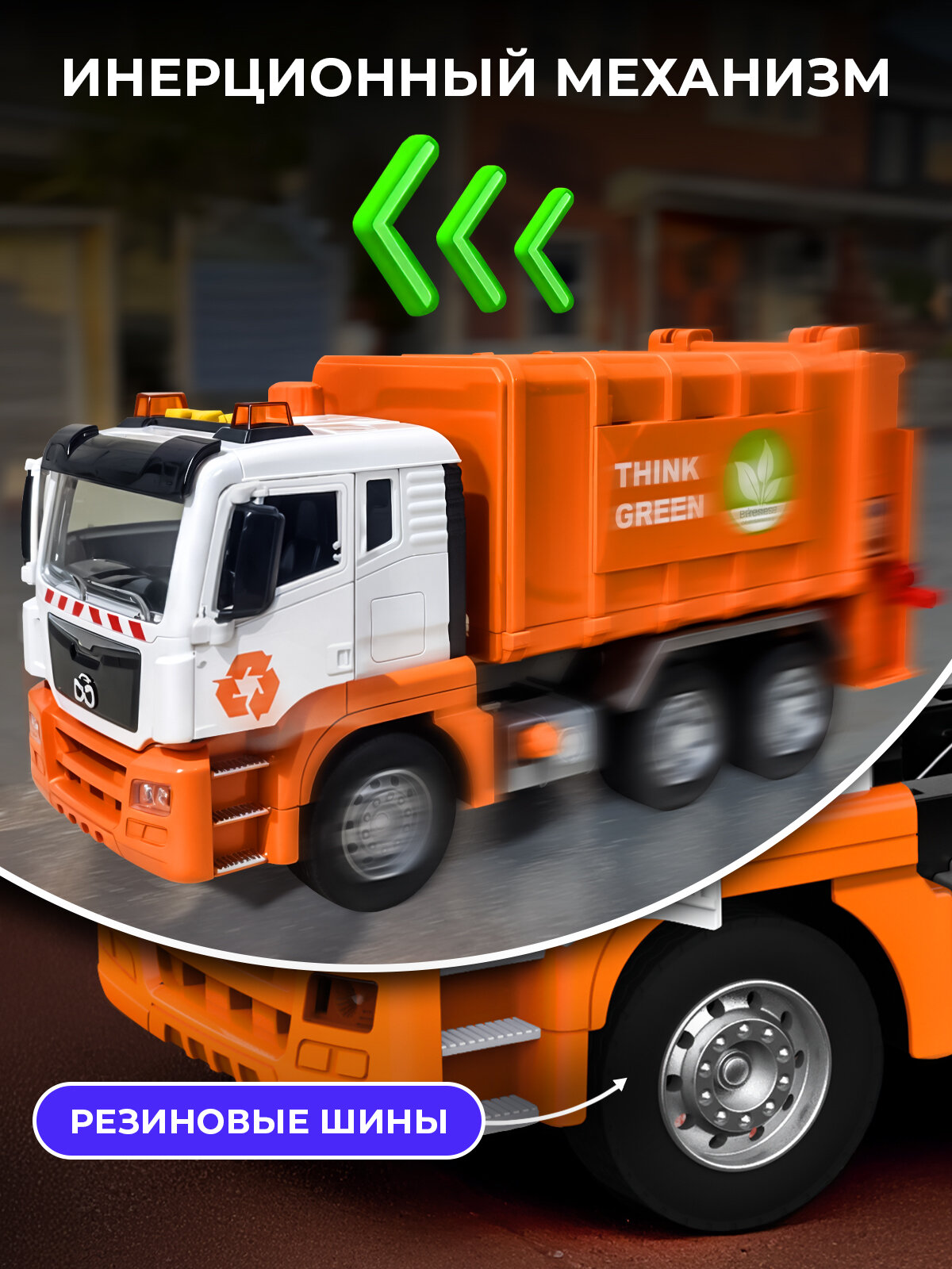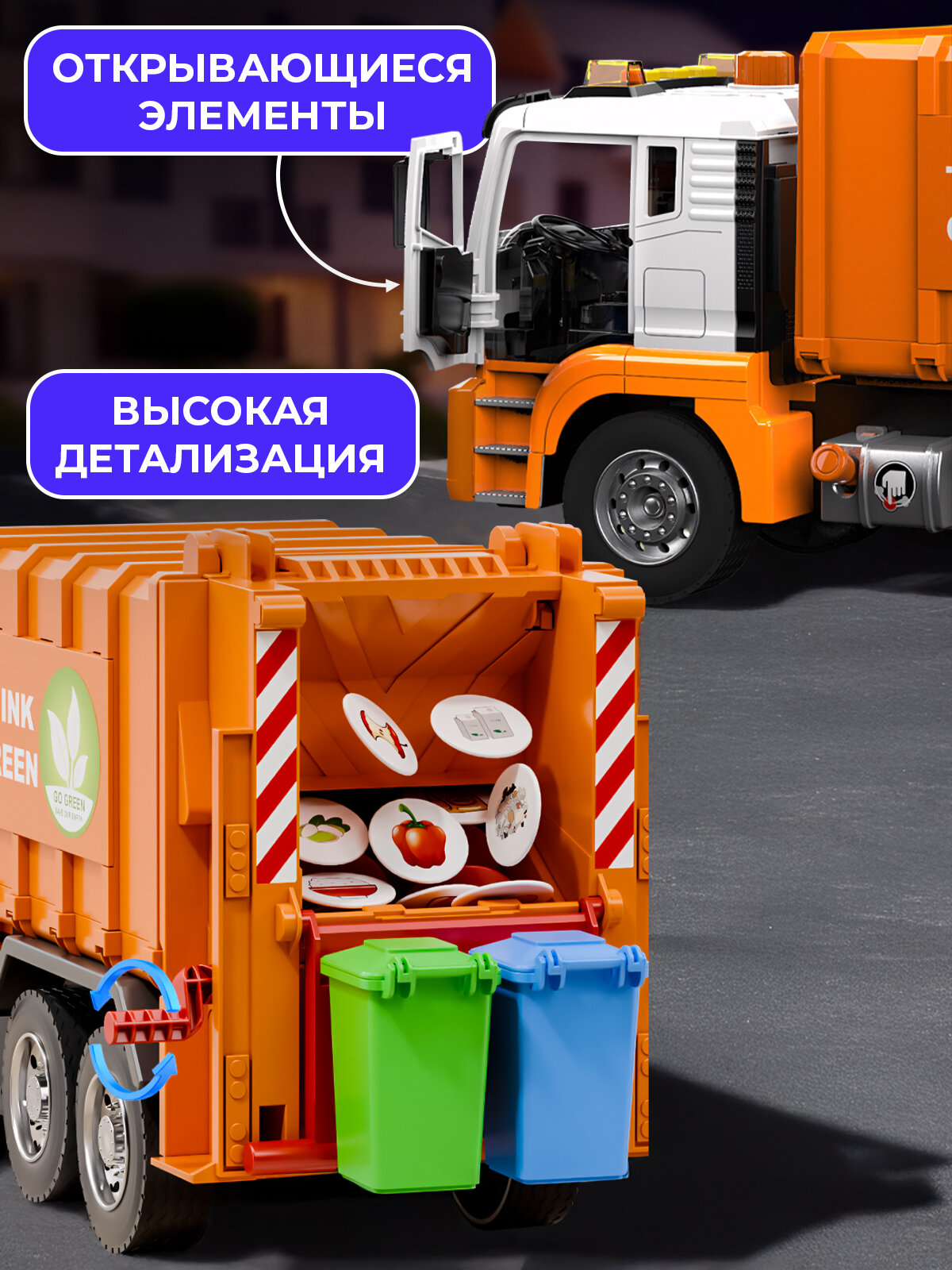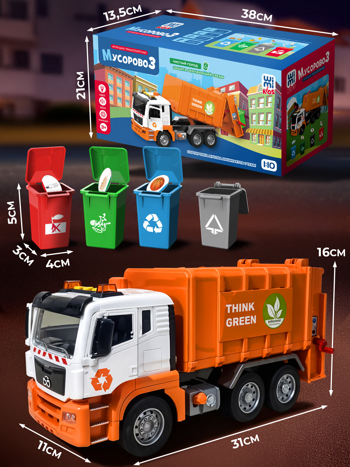 - Габариты 31×11×16 см повторяют пропорции настоящего мусоровоза
