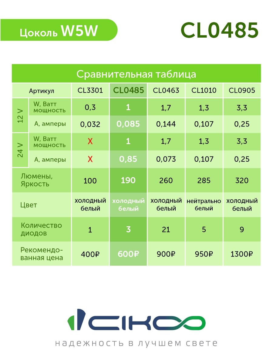 Светодиодные лампы CIKOO W5W созданы для замены штатных габаритных огней типа T10 или T15. При мощности 5Вт они выдают 180 люмен — в 1.8 раз ярче ламп накаливания при 30% энергопотребления. Универсальное напряжение 12-24V охватывает: