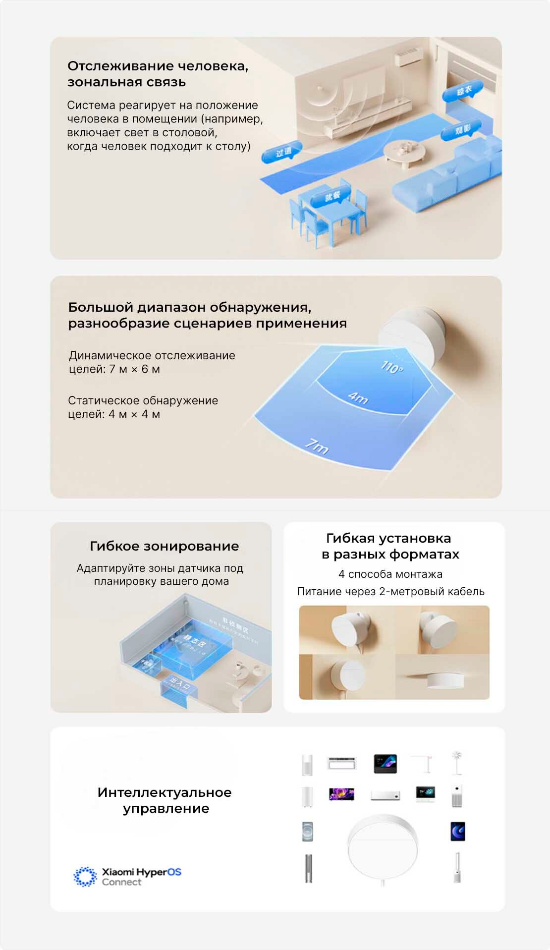 Двойная система обнаружения (инфракрасный сенсор + алгоритм анализа движения) минимизирует ложные срабатывания Xiaomi XMMWR01XS. Настройки в приложении позволяют: