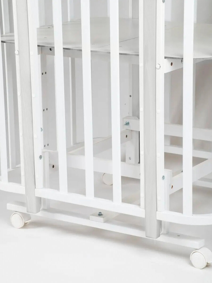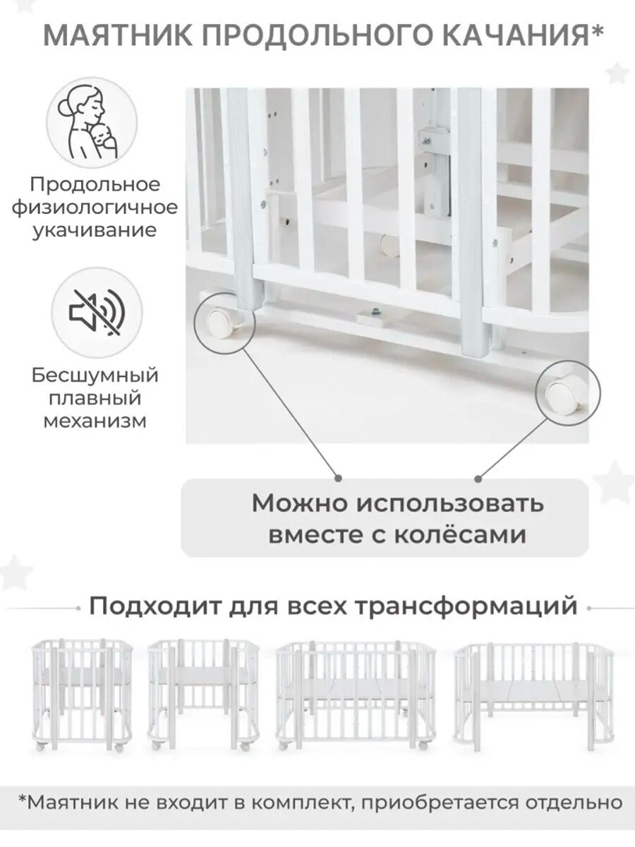 Маятниковое качание продольного типа обеспечивает плавное укачивание новорожденного без рывков. Технология десятикратных тестов на износ подтвердила: механизм выдерживает 60.000 циклов качания — эквивалент 3 лет ежедневного использования. В отличие от поперечных моделей, продольное качание повторяет естественное движение при ношении ребенка на руках.