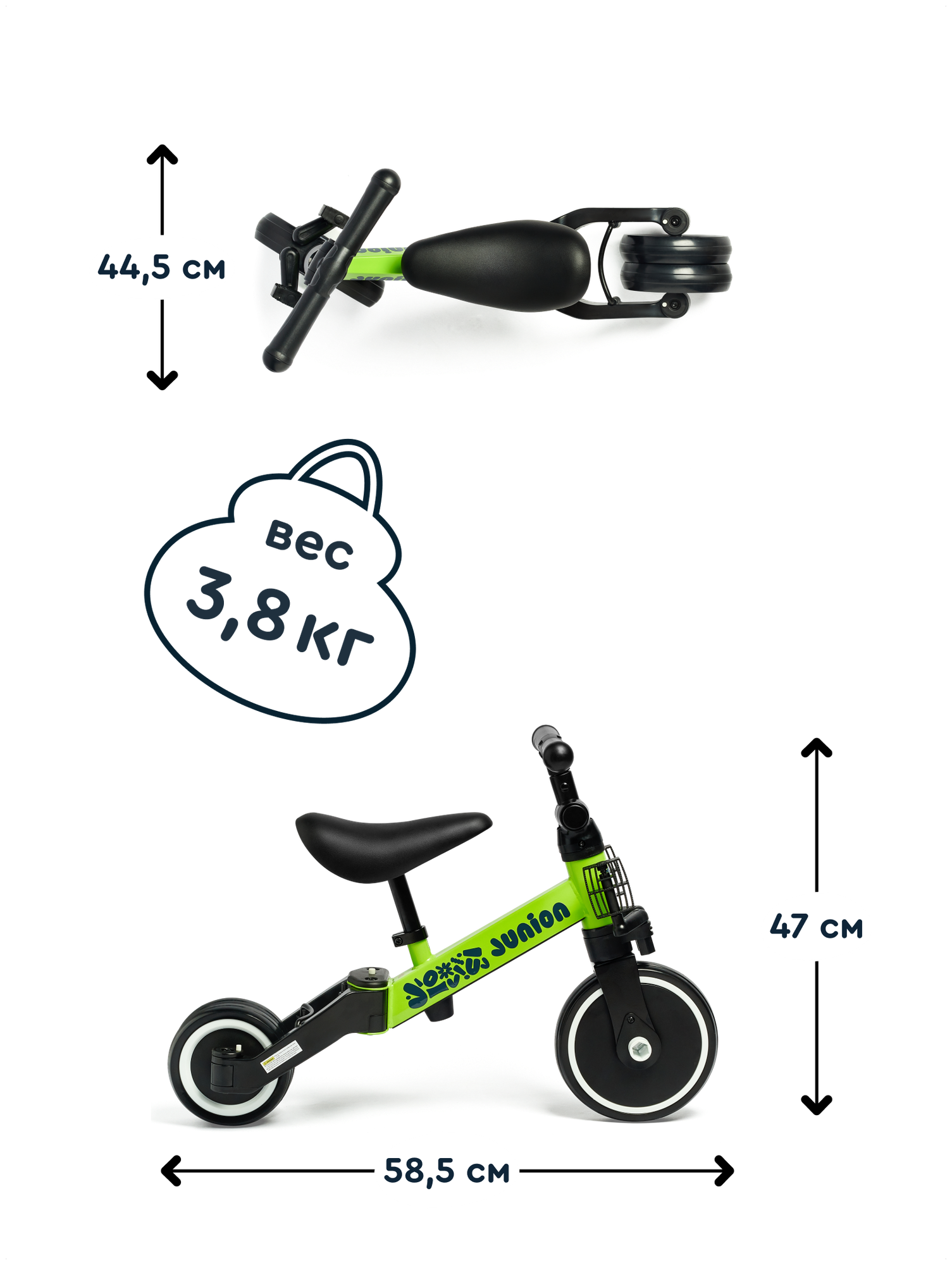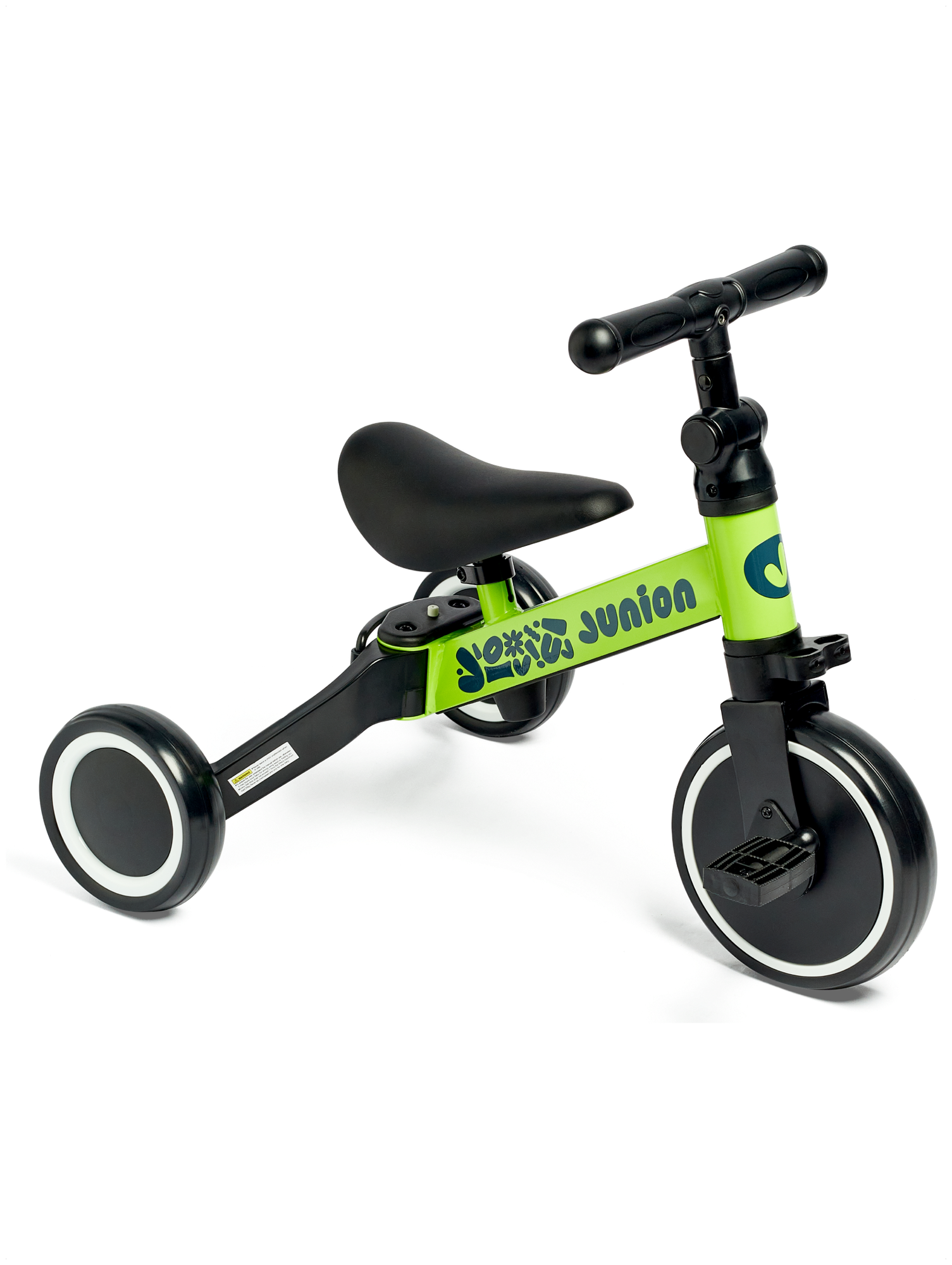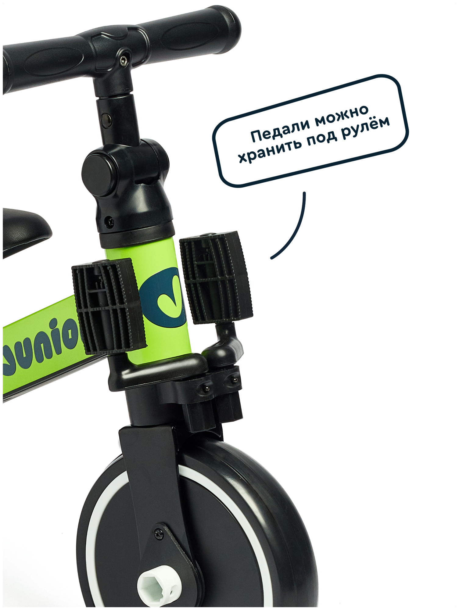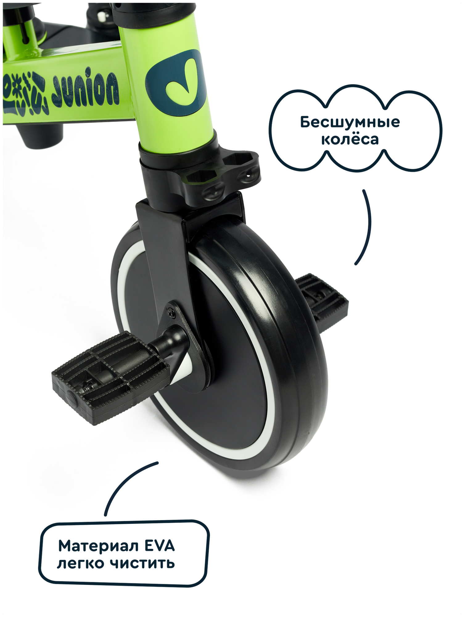 Беговел-трансформер Junion Stepni адаптируется под возрастные этапы развития. Алюминиевая рама весом 3.8 кг позволяет ребёнку самостоятельно управлять транспортом:
