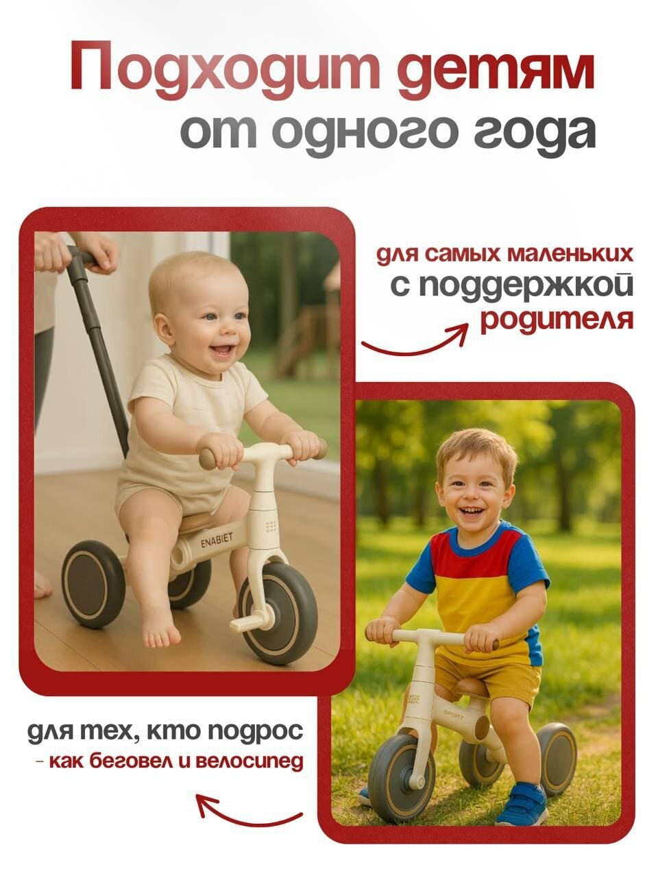 Беговел KIDZONA 4в1 адаптируется под потребности ребёнка благодаря четырём режимам трансформации. Сначала это классический беговел с минимальной посадкой (высота сиденья 25 см от земли), позволяющий малышам от 1 года учиться балансировать. При дальнейшем росте ребёнка раму можно переконфигурировать в трёхколёсный велосипед с дополнительной устойчивостью за счёт боковых колёсиков с противоскользящими накладками. Отследить текущий режим поможет цветовая индикация на элементах рамы.