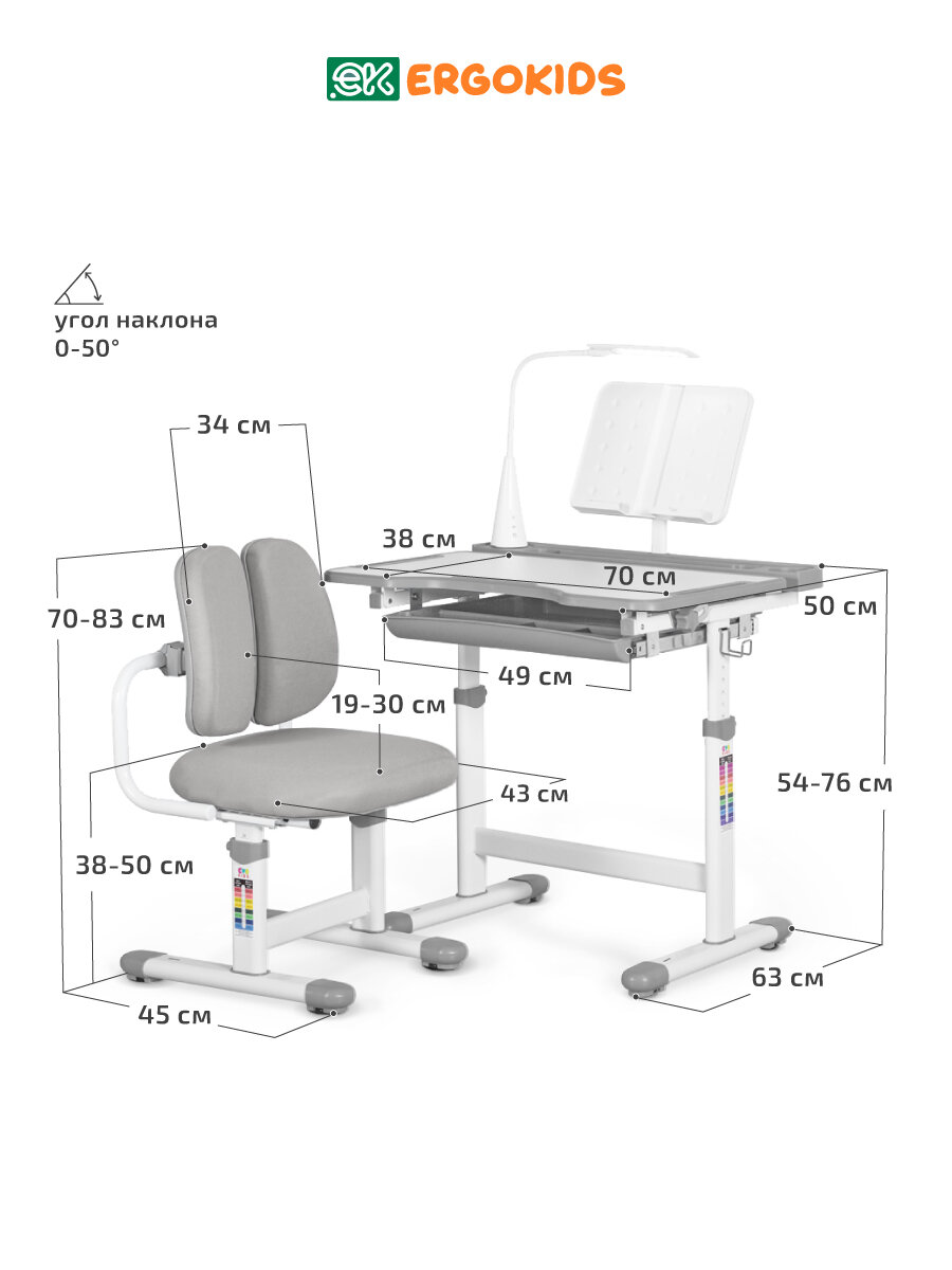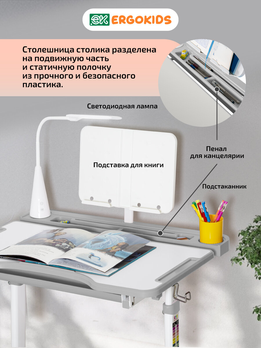 Ergokids Krona BD-23 адаптируется под рост от 90 до 150 см благодаря системе Gas-lift. Механизм позволяет менять высоту стула и стола без инструментов за 3 шага: