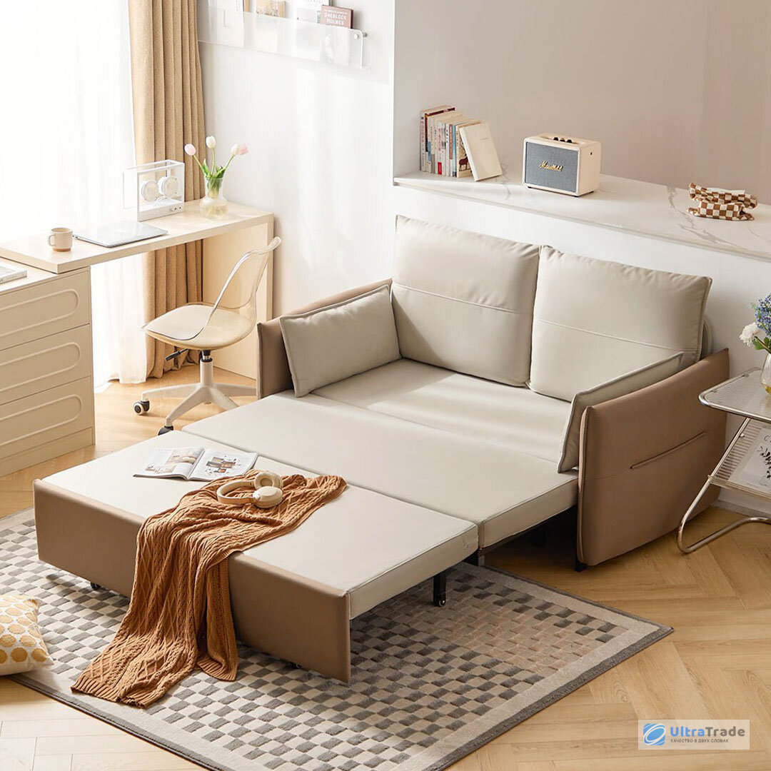 - Трансформация «книжка» обеспечивает три положения: сидя (850 мм глубина), полулежа (1100 мм), спальное место (1620×1900 мм)