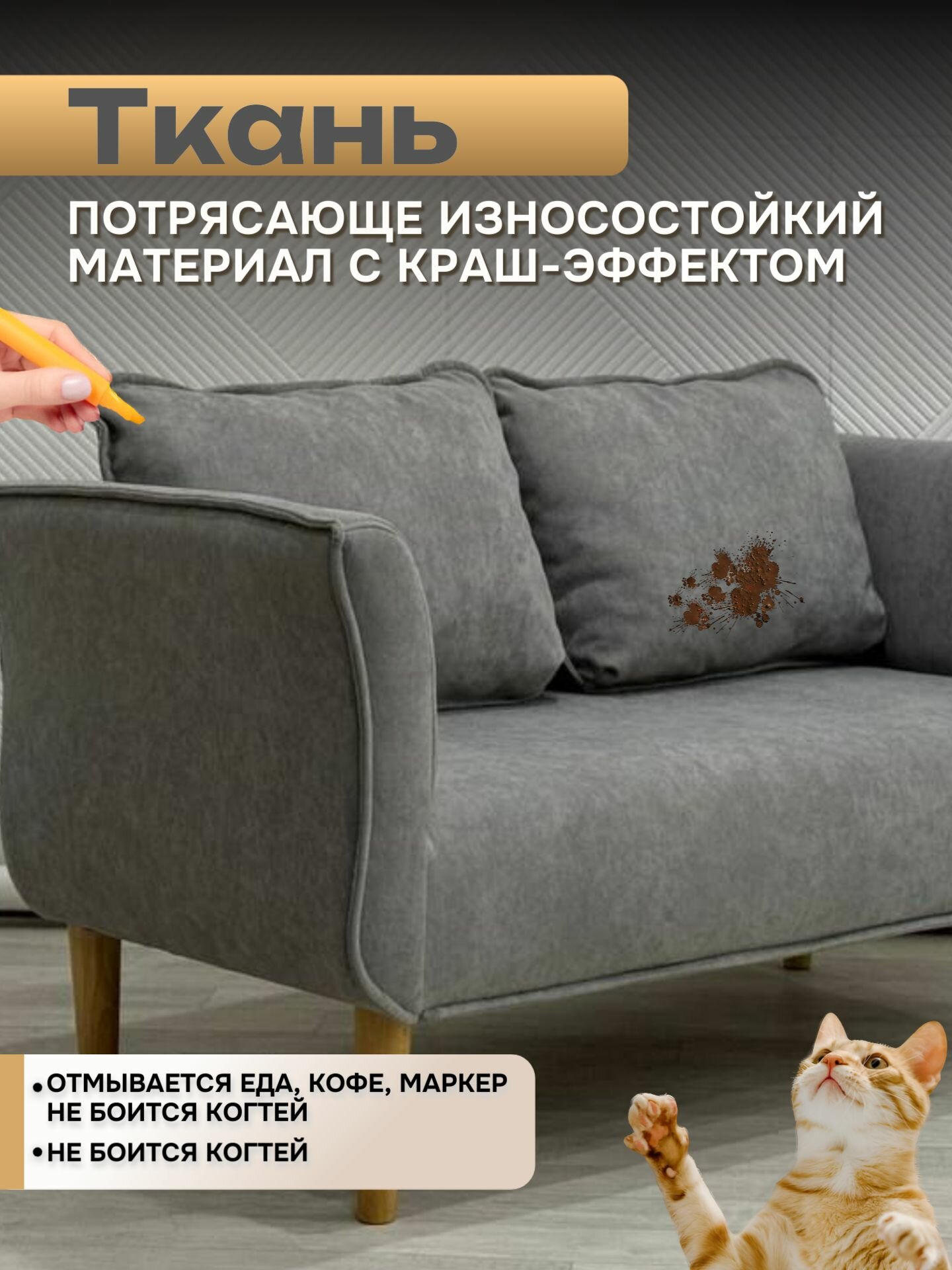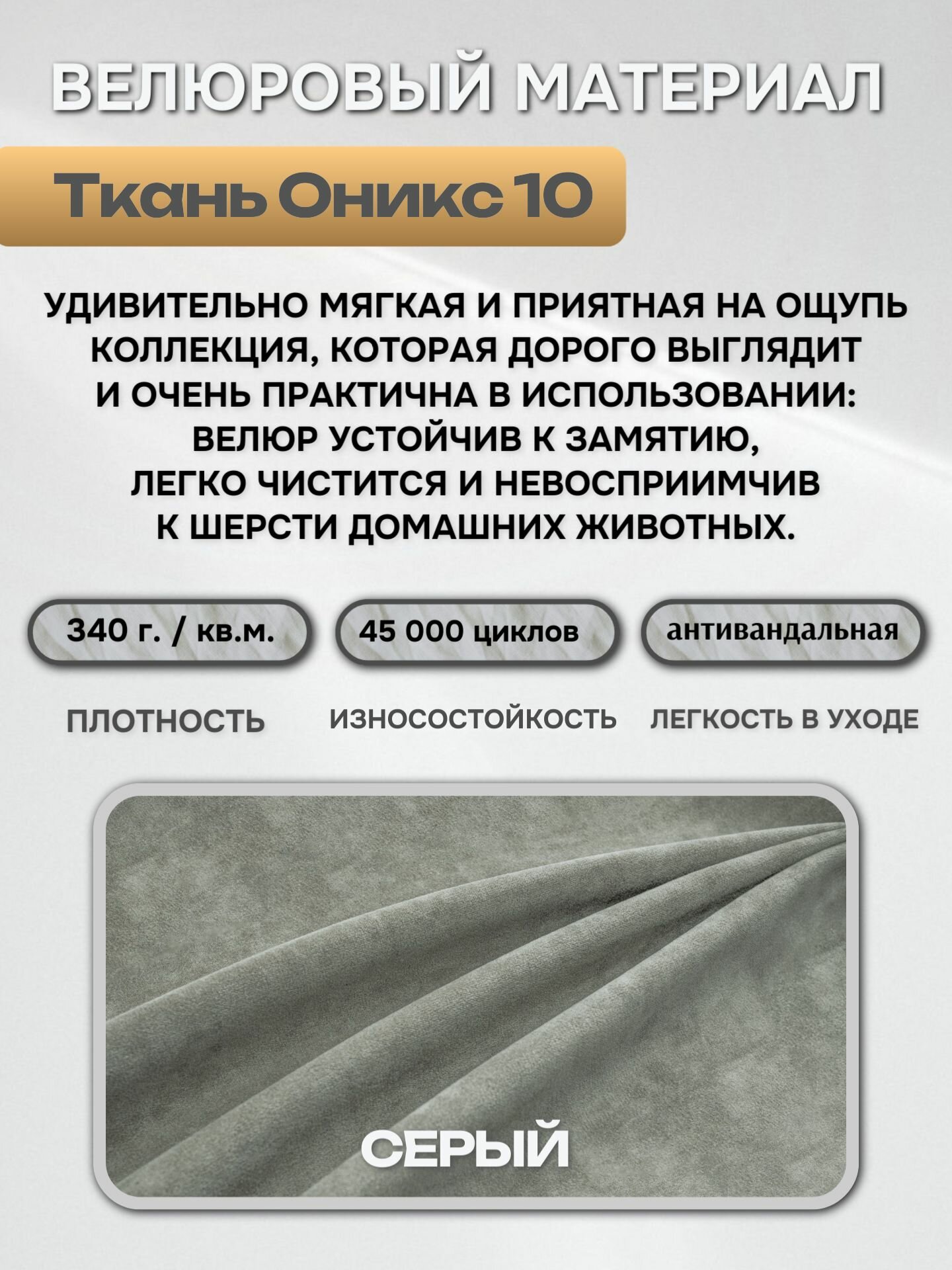 Антивандальный велюр Оникс 10 прошел испытания по методике Мартиндейла – 40 000 циклов (класс 4 по ГОСТ 29298-2005). Это в 2 раза превышает стандартные требования к мебельным тканям. Плотность плетения 360 г/м² гарантирует устойчивость к: