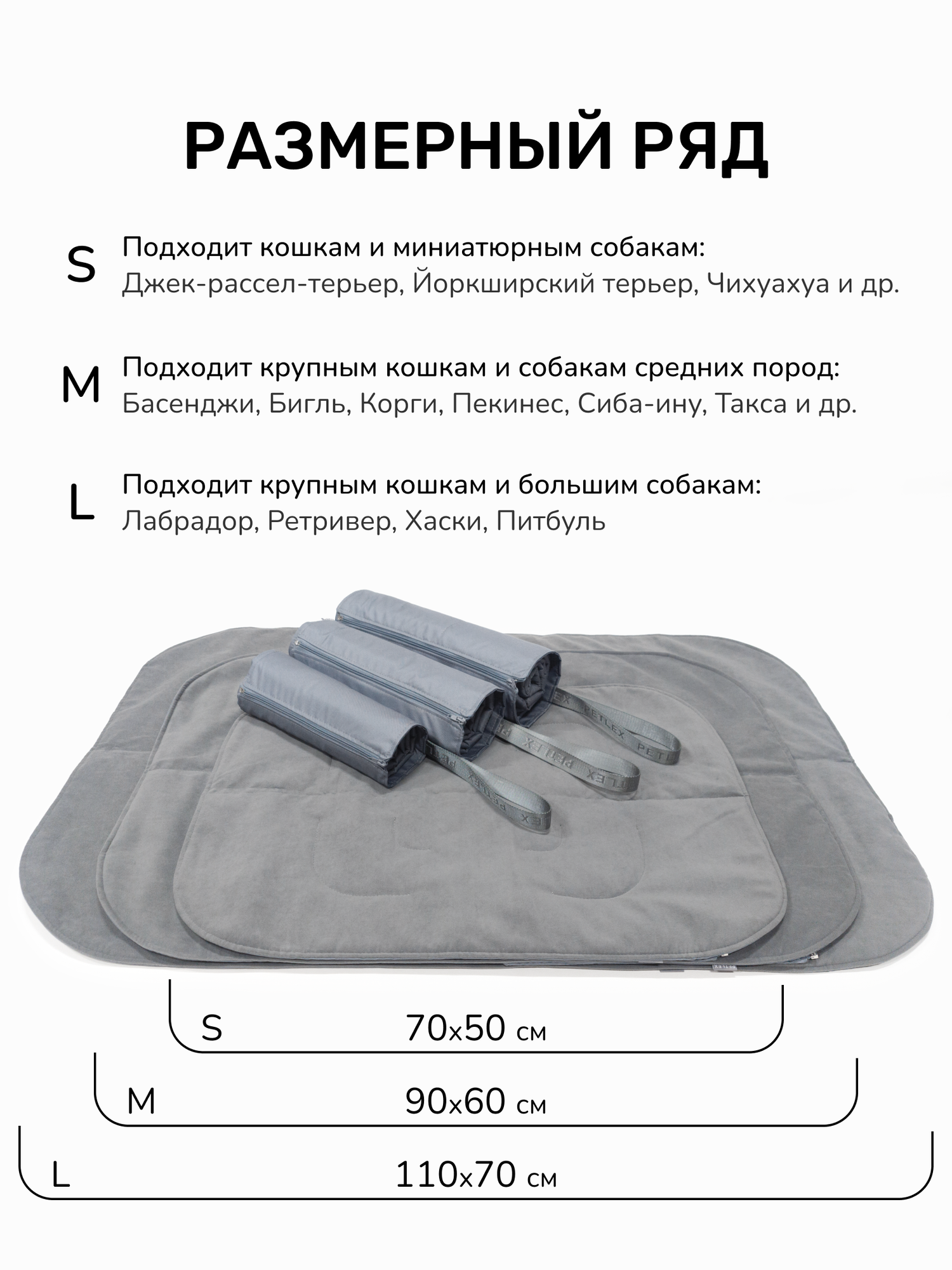 Размеры 110х70 см соответствуют требованиям для пород до 25 кг: бигль, шарпей, спаниель. Наполнитель из вспененного полиэтилена толщиной 1.8 см создаёт амортизацию – защищает суставы при отдыхе на твёрдых поверхностях.