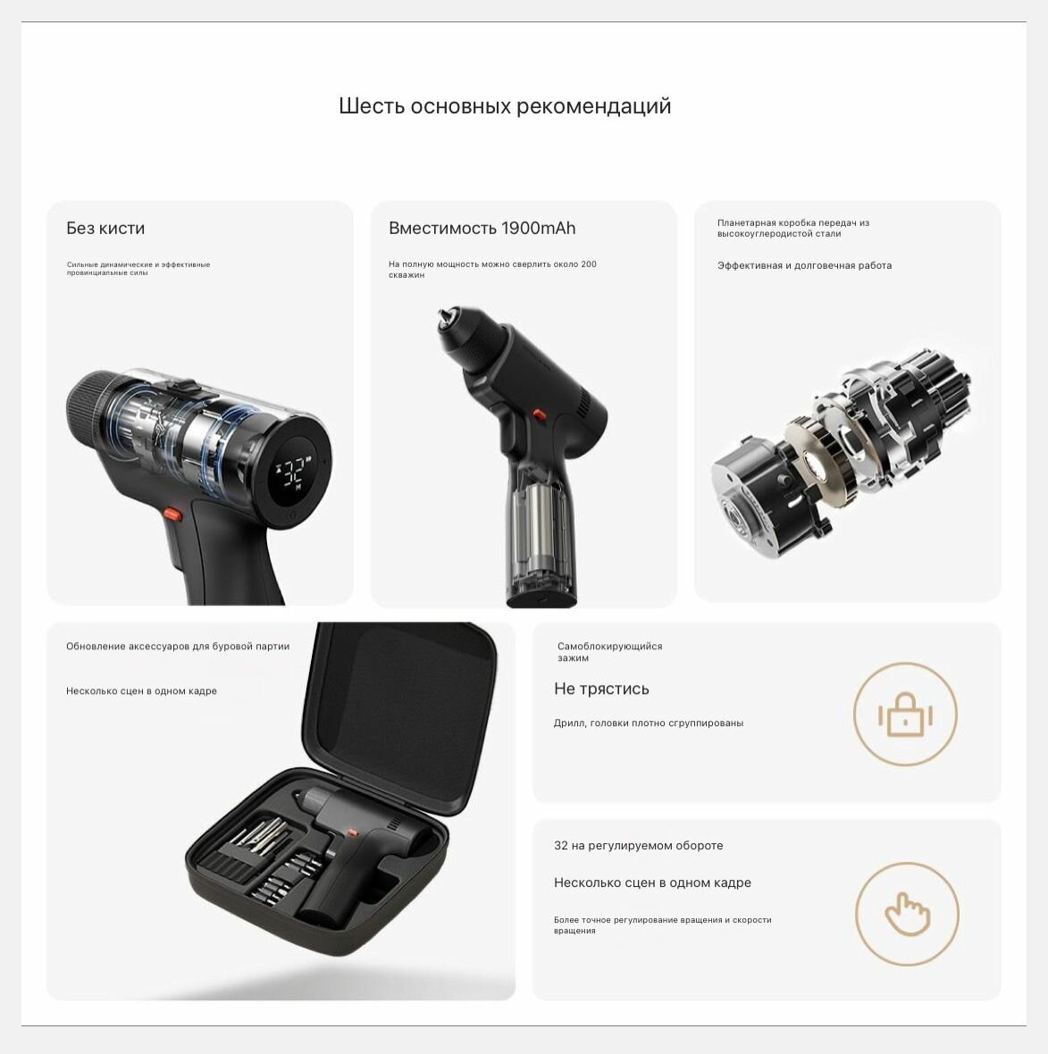 Бесщёточная дрель-шуруповёрт Xiaomi Mijia Brushless оснащена двигателем нового поколения с номинальным напряжением 14.4 В. Модель обеспечивает максимальный крутящий момент 50 Н·м в ударном режиме, что позволяет работать с бетонными поверхностями. Двигатель BLDC отличается от щёточных аналогов тремя ключевыми преимуществами: