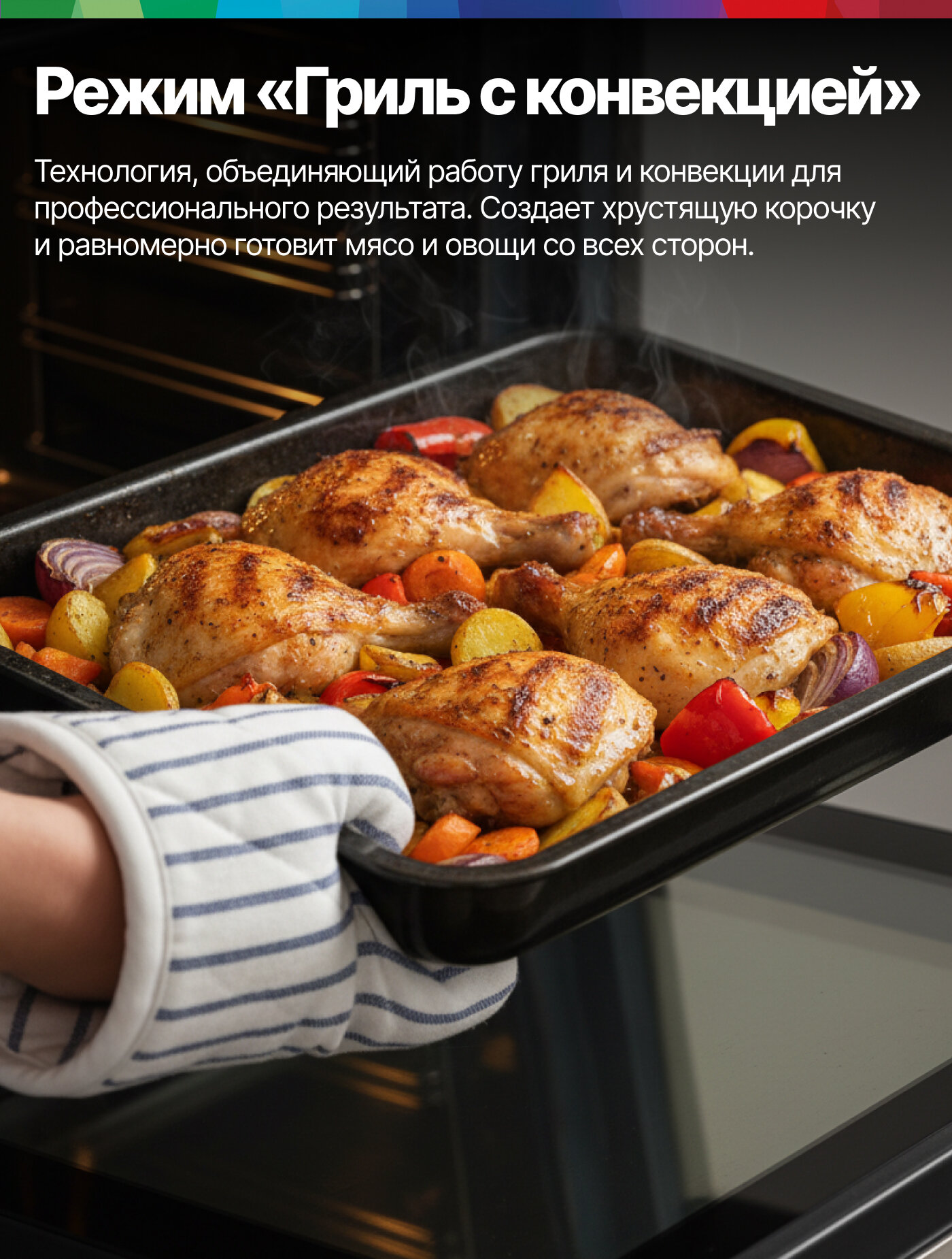 - 10 температурных режимов включают гриль с конвекцией для равномерного запекания