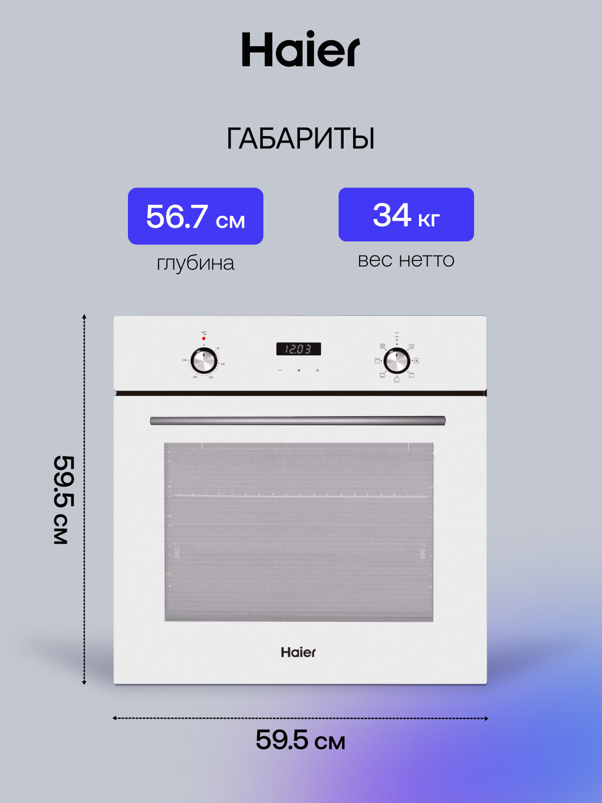 Независимая установка Haier HOX-P06HGW позволяет монтировать технику отдельно от варочной панели. Для установки требуется стандартная ниша высотой 60 см с минимальным зазором 2-3 мм по бокам. Техника имеет ширину 59.5 см при глубине корпуса 55 см — стандартный размер для большинства кухонных гарнитуров.