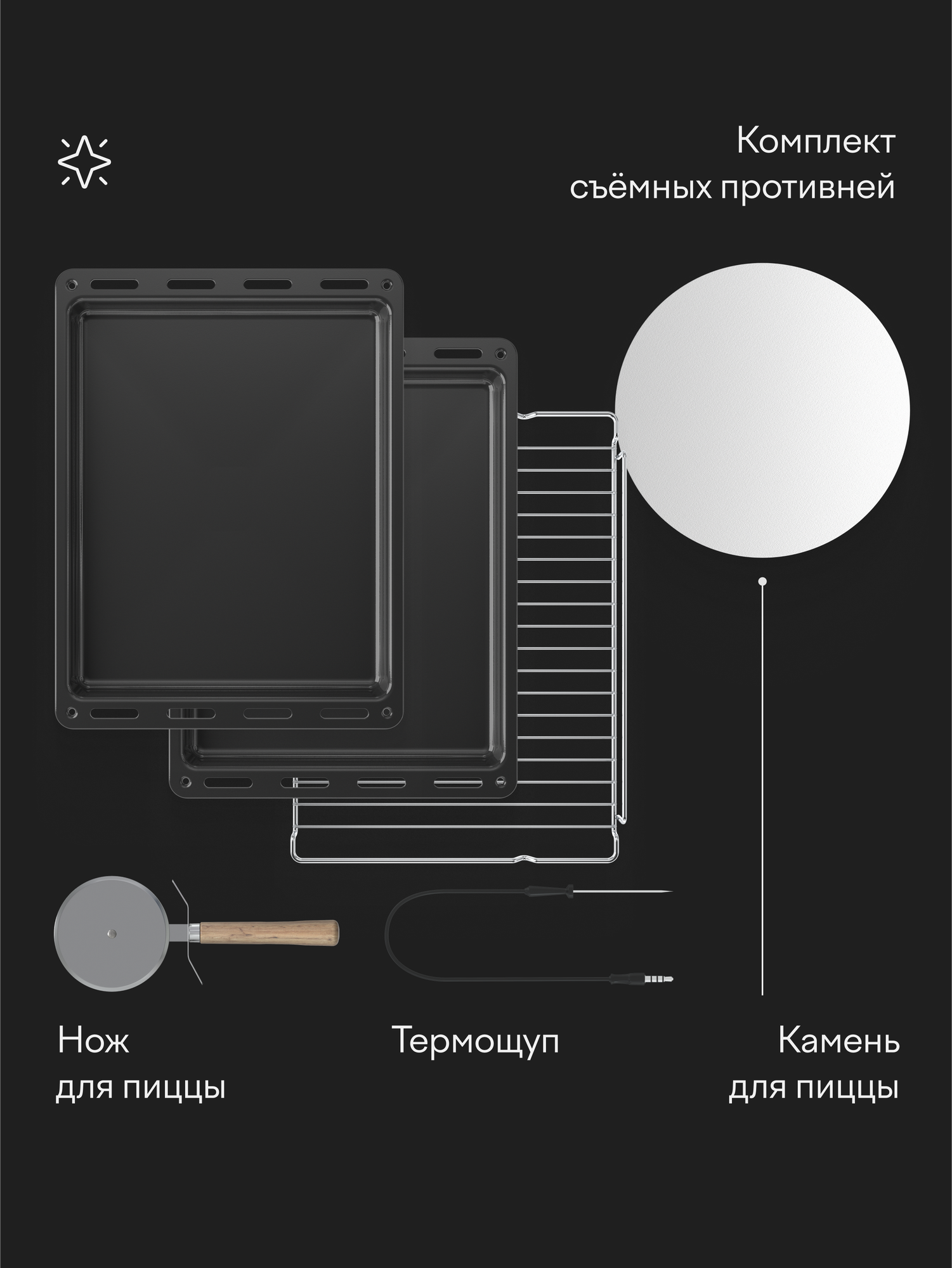 В комплекте - 2 противня с антипригарным слоем и решетка-гриль из хромоникелевой стали.