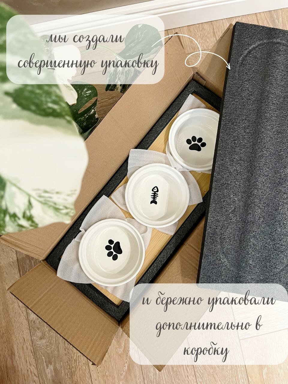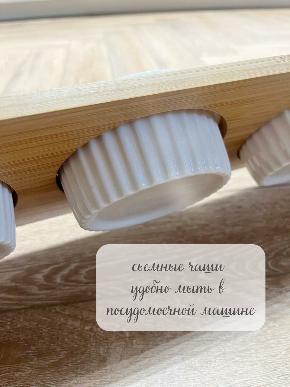 Миска-подставка выполнена из сертифицированной древесины с тремя съёмными секциями разных типов: