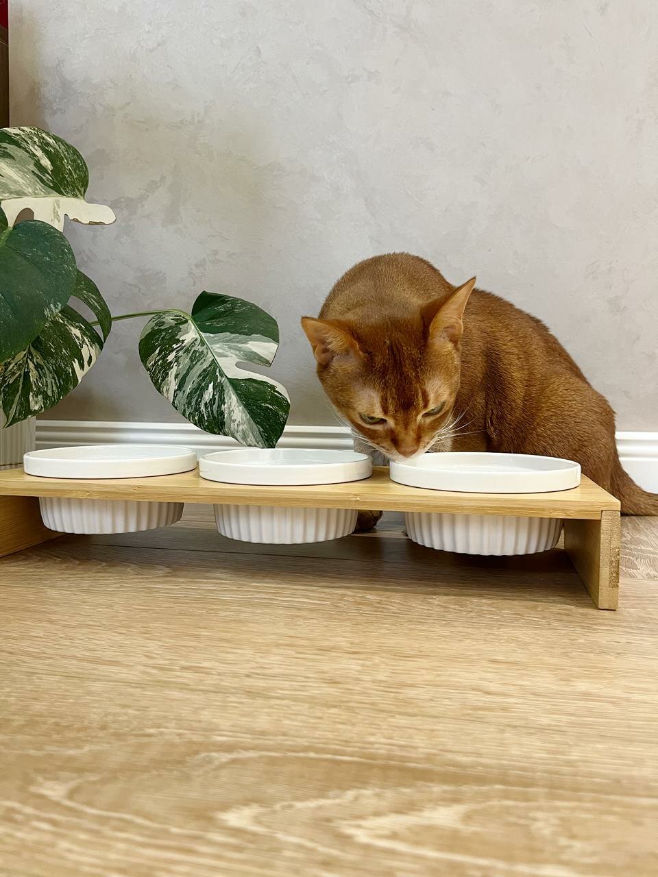 Тройная миска для животных на деревянной подставке — надёжное решение для раздельного питания