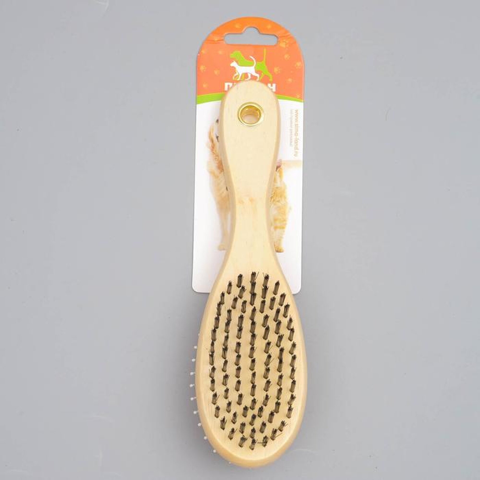 Двусторонняя щётка-пуходёрка с деревянной ручкой создана для комплексного ухода за шерстью всех пород собак. Боковой густой щетиной удобно вычёсывать плотный подшёрсток, а редкие металлические зубцы эффективно распутывают колтуны без повреждения остевого волоса.