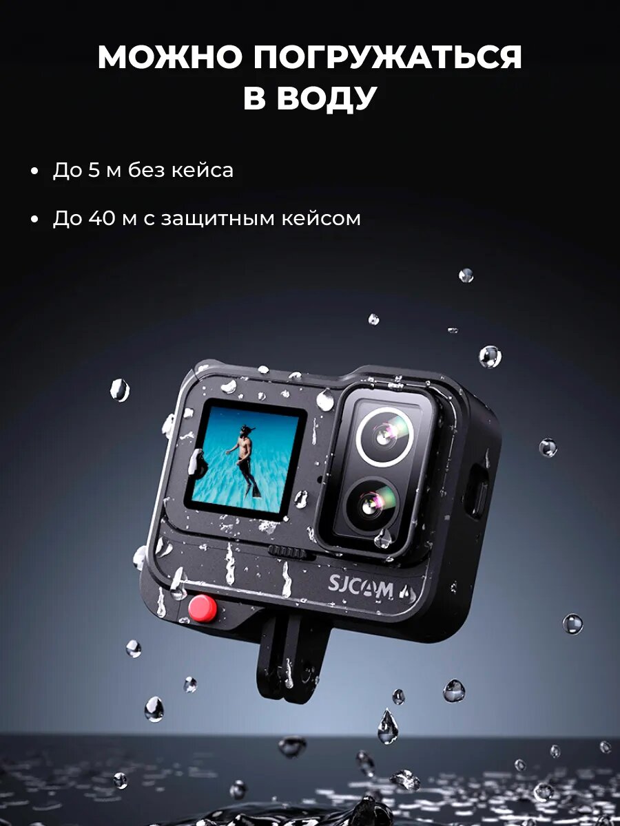 Герметичный корпус стандарта IPX8 выдерживает погружение на 5 метров без аквабокса. В комплекте с боксом для глубины 40м камера прошла тесты при подводной охоте. Вес 150г оптимален для крепления на шлем без эффекта "тяжёлой головы".