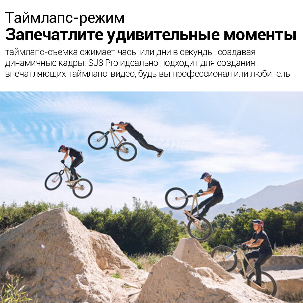 Экшн-камера SJCam SJ8 Pro создана для съёмки активных действий в разрешении 3840×2160 при 60 кадрах в секунду. 12-мегапиксельная матрица фиксирует детализацию объектов даже при медленной съёмке 120 FPS в формате Full HD. Производитель комплектует устройство тремя базовыми аксессуарами: универсальным креплением, герметичным боксом для подводной съёмки и Bluetooth-пультом управления.