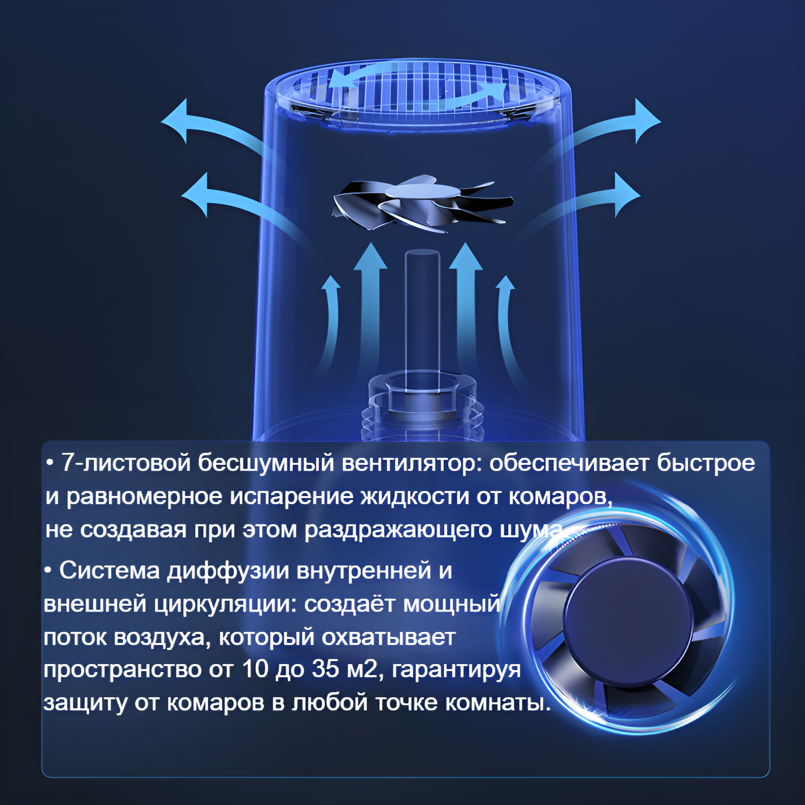 Электрический фумигатор с площадью действия 35 м² создает защитную зону от комаров за счет равномерного испарения инсектицида. Принцип работы основан на термальном нагреве пластин при температуре 145°C, что гарантирует: