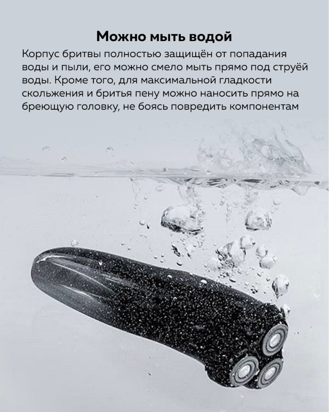 - Двухрежимное использование — сухое бритьё за 5 минут или комбинирование с пеной/гелем