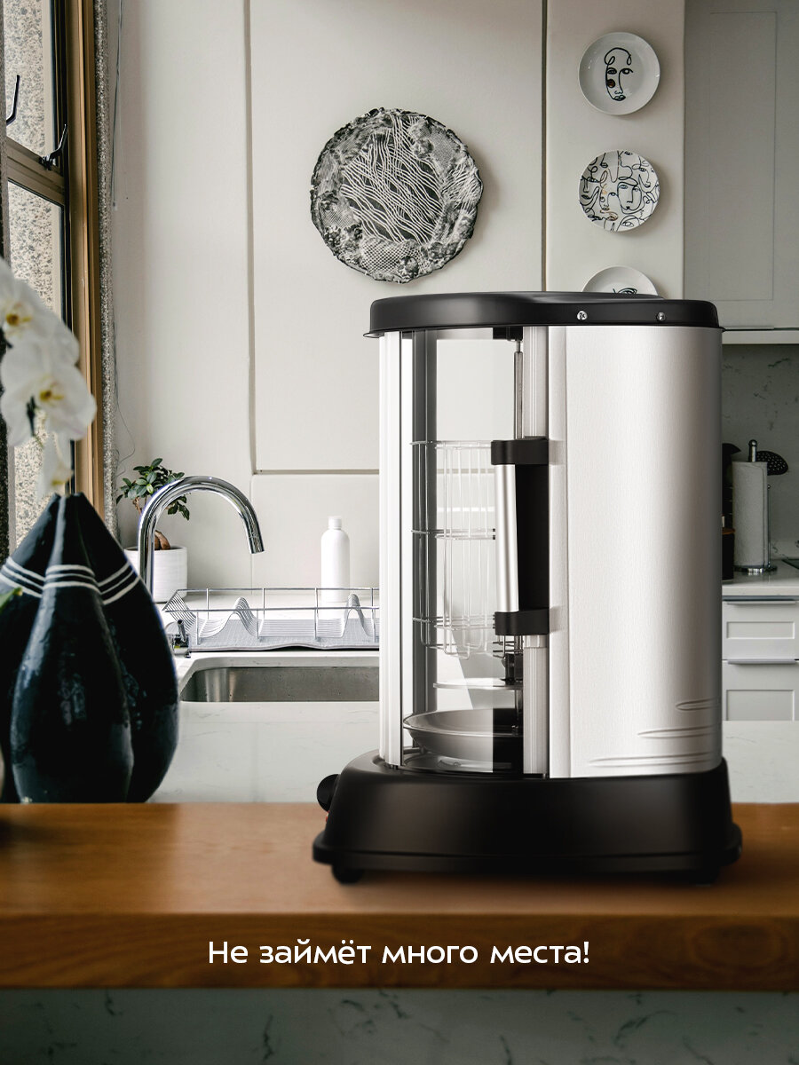Габариты 33.4x28.2x44.6 см позволяют размещать устройство на стандартной кухне (требуемая площадь – 30x30 см). Вес 4.9 кг удобен для переноса на балкон или террасу.