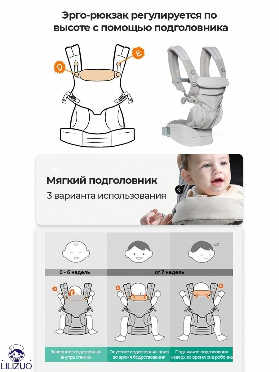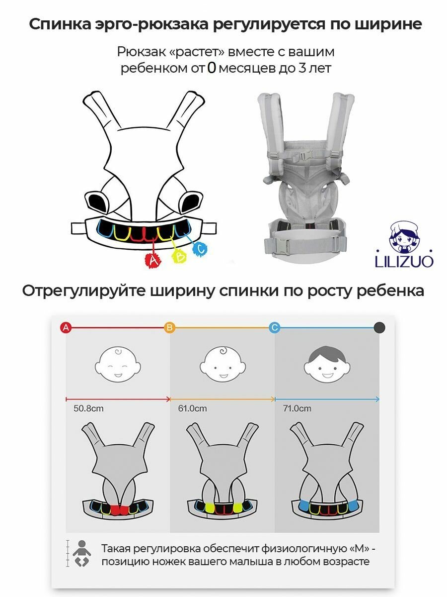 Эрго-переноска Aimama Omni 360 адаптируется под рост ребенка благодаря запатентованной системе удлинения спинки (от 48 до 86 см) и регулируемой ширине сиденья. В отличие от аналогов с фиксированными размерами, это позволяет обеспечивать: