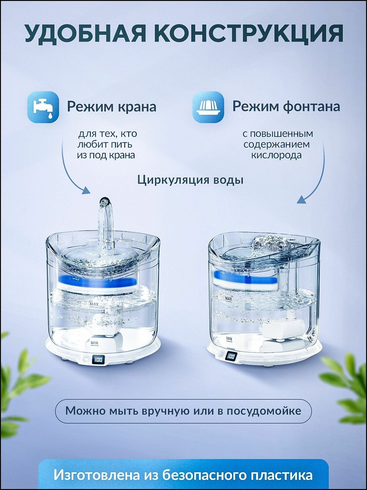Для длинношёрстных пород предусмотрена усиленная фильтрация волосяного покрова. Пожилым кошкам подойдёт режим с низкой высотой струи. Котятам разработчики добавили защиту от попадания лап в зону насоса.