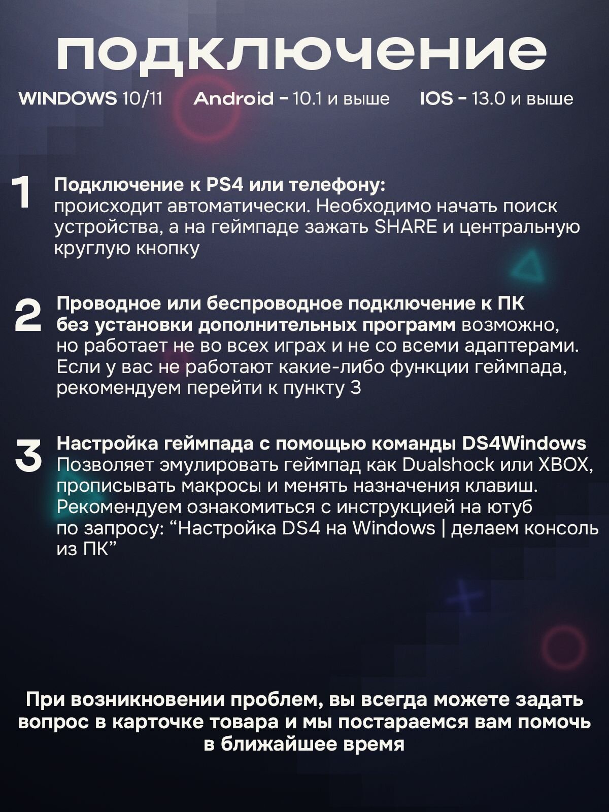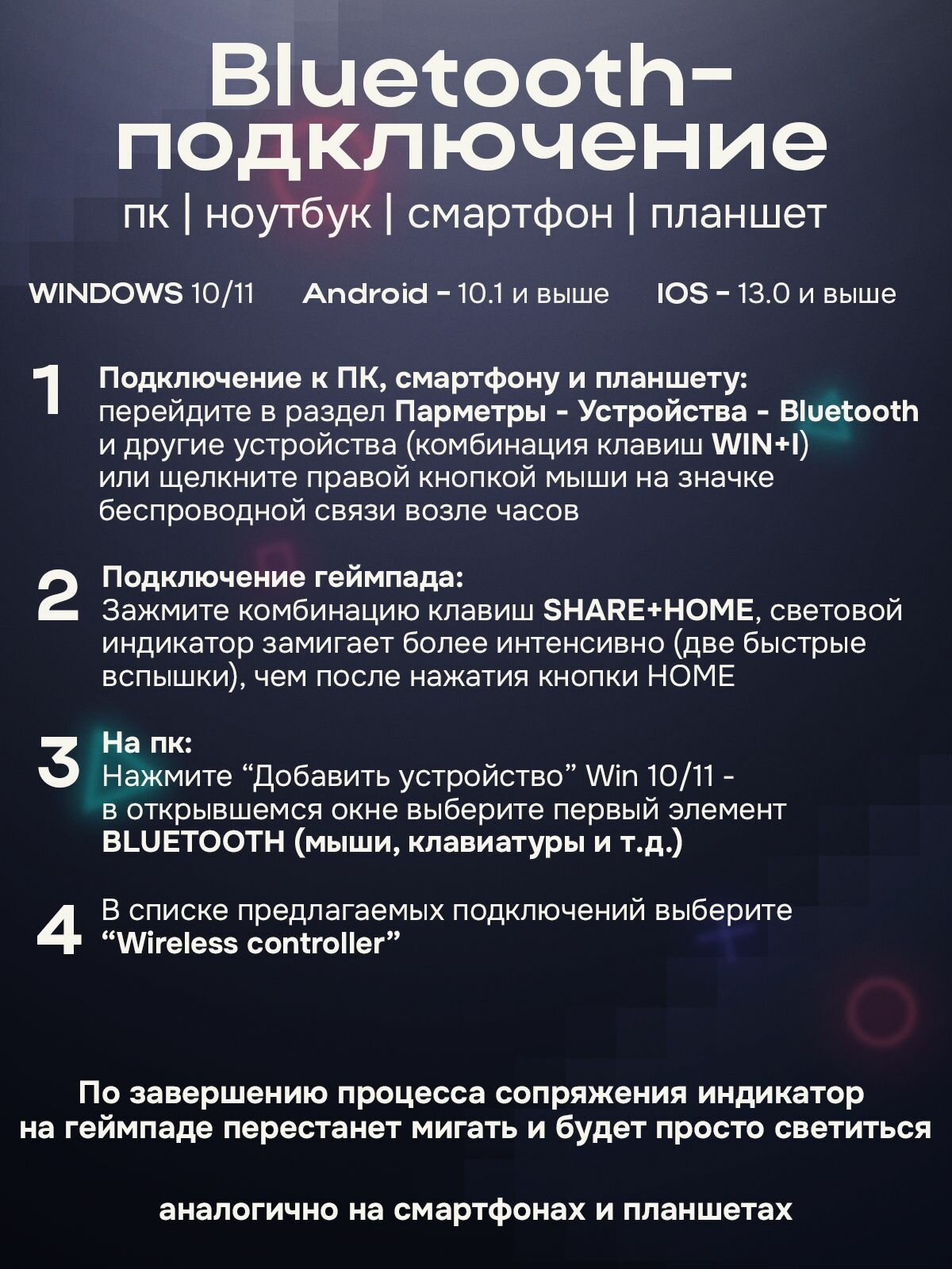Прозрачный геймпад подключается к PS4 через Bluetooth 5.0 за 3 секунды. Для PS5 требуется обновление ПО консоли до версии 21.02-04.30.00 или выше. Беспроводной режим поддерживает одновременное подключение к смартфону (Android 10+/iOS 14+) и компьютеру через раздельные каналы.