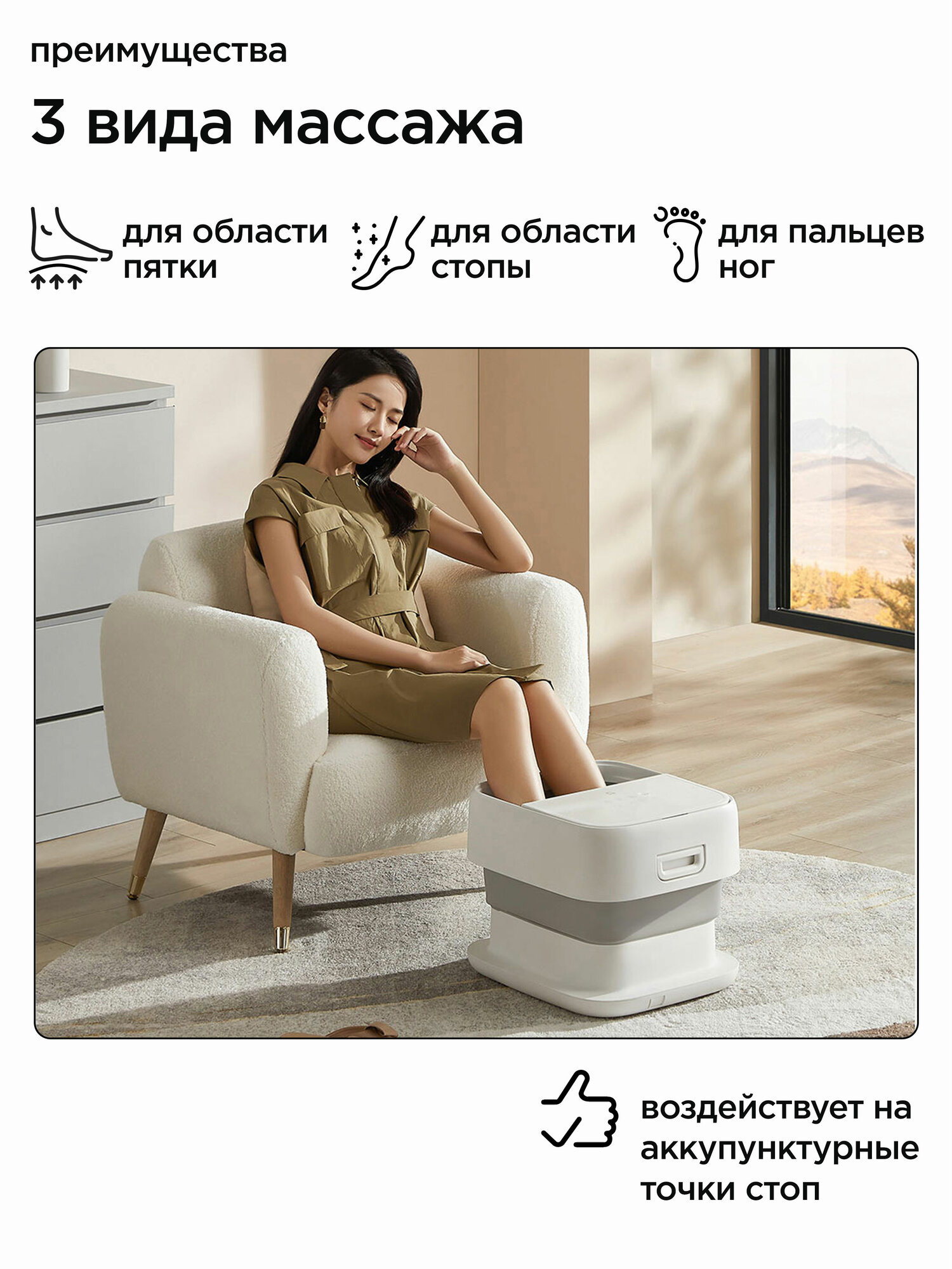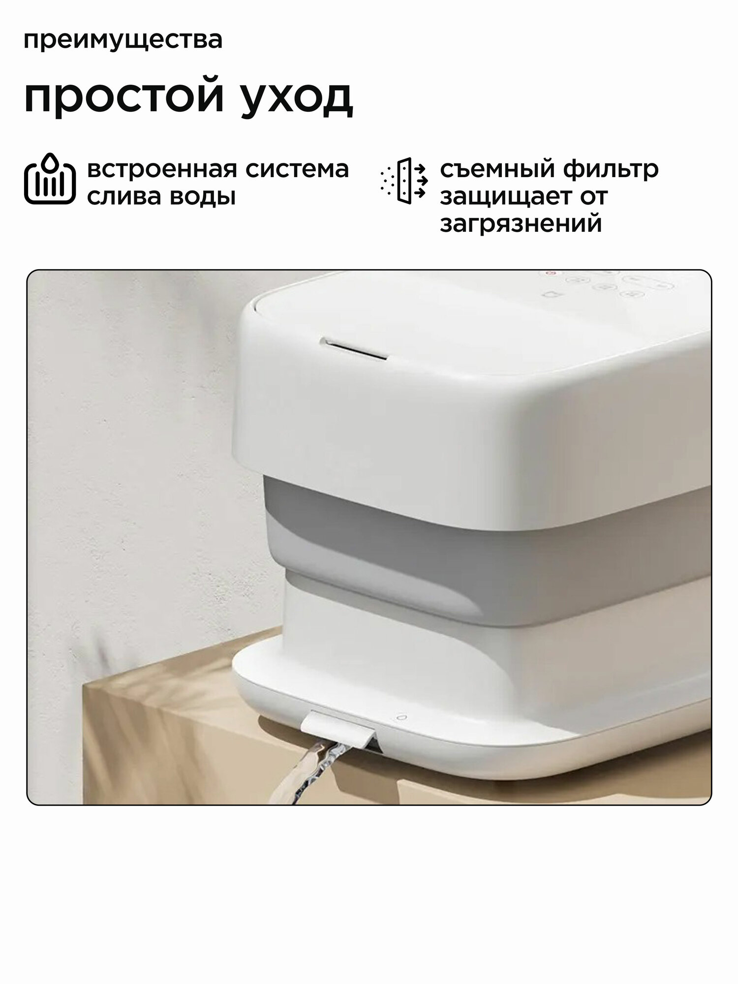 Мощность 950 Вт обеспечивает быстрый нагрев воды до 42°C с автоматическим поддержанием температуры (±1°C). Система роликовых массажеров включает 6 вращающихся элементов для проработки акупунктурных точек на стопах. Пузырьковая функция создаёт 360 водяных струй одновременно, улучшая кровообращение.