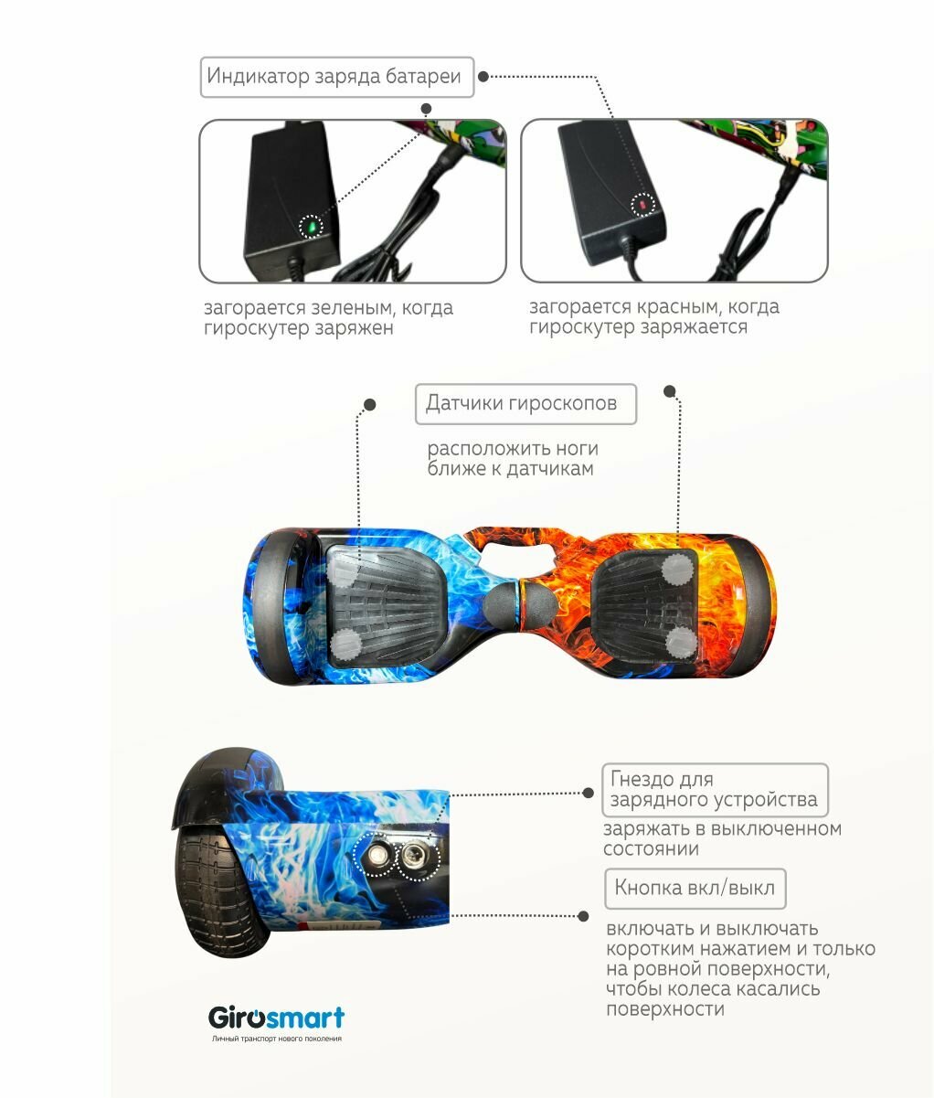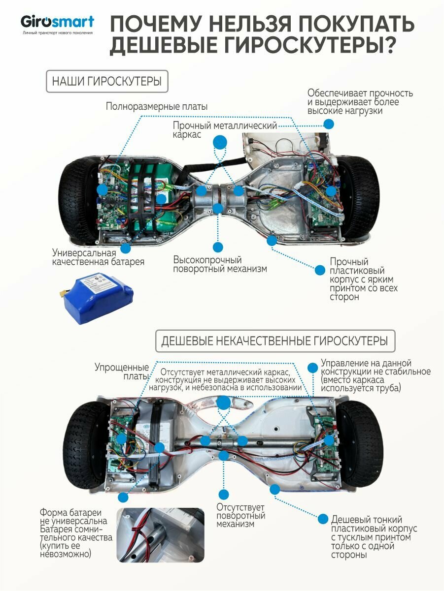 - Диаметр колес 6.5 дюймов — обеспечивает маневренность в 1.5 раза выше 8-дюймовых моделей при поворотах на 90°