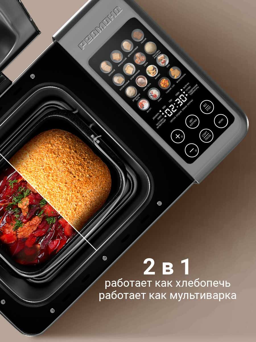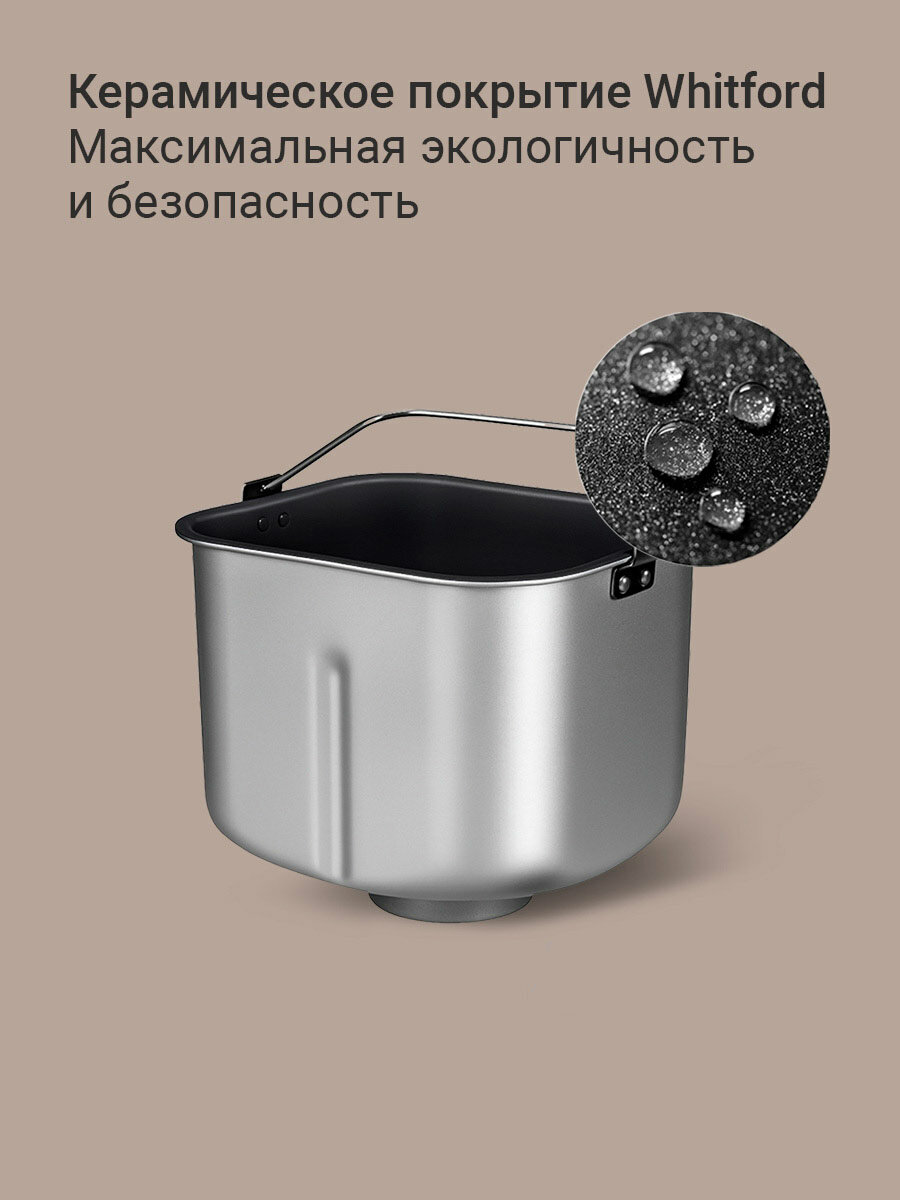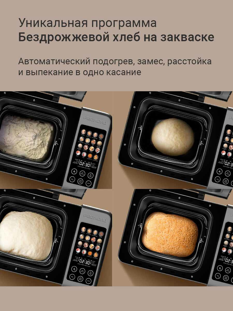 Диспенсер для автодобавления поддерживает 4 типа ингредиентов — от изюма до орехов, которые загружаются в специальные контейнеры. Сенсорная панель с 16 программами вклчает уникальные режимы: