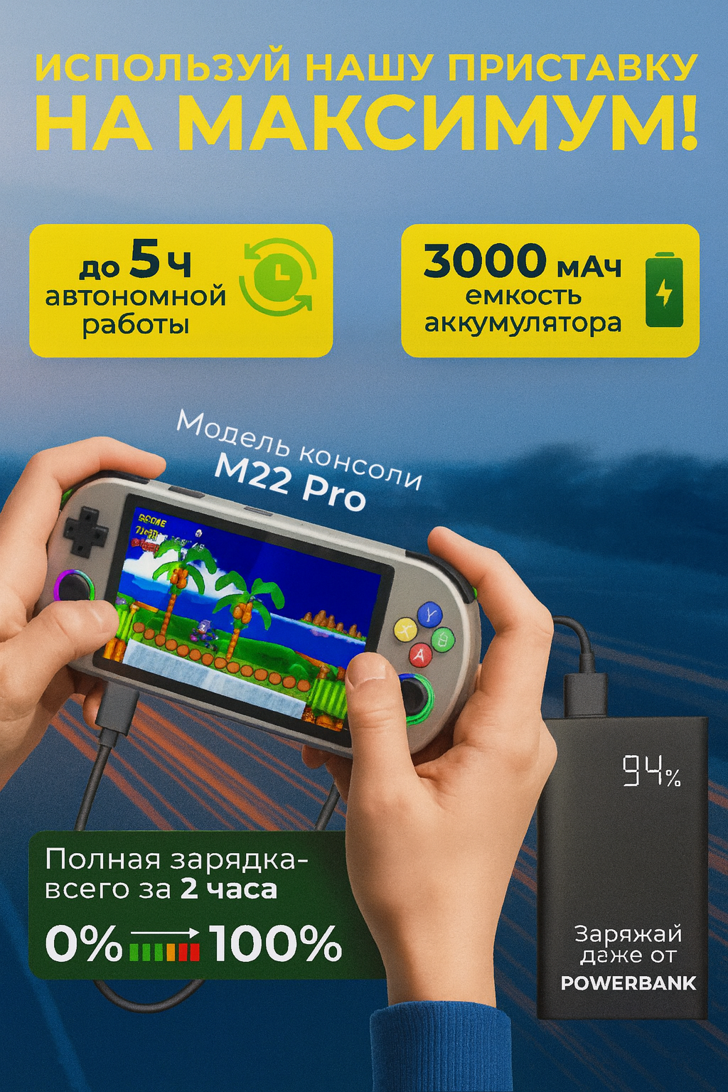 Портативная конструкция M22 решает главную проблему мобильного гейминга – компромисс между размером и функциональностью. При весе 520 грамм консоль помещается в рюкзак школьника или дорожную сумку, а 5-дюймовый экран сохраняет четкость изображения даже на солнце.