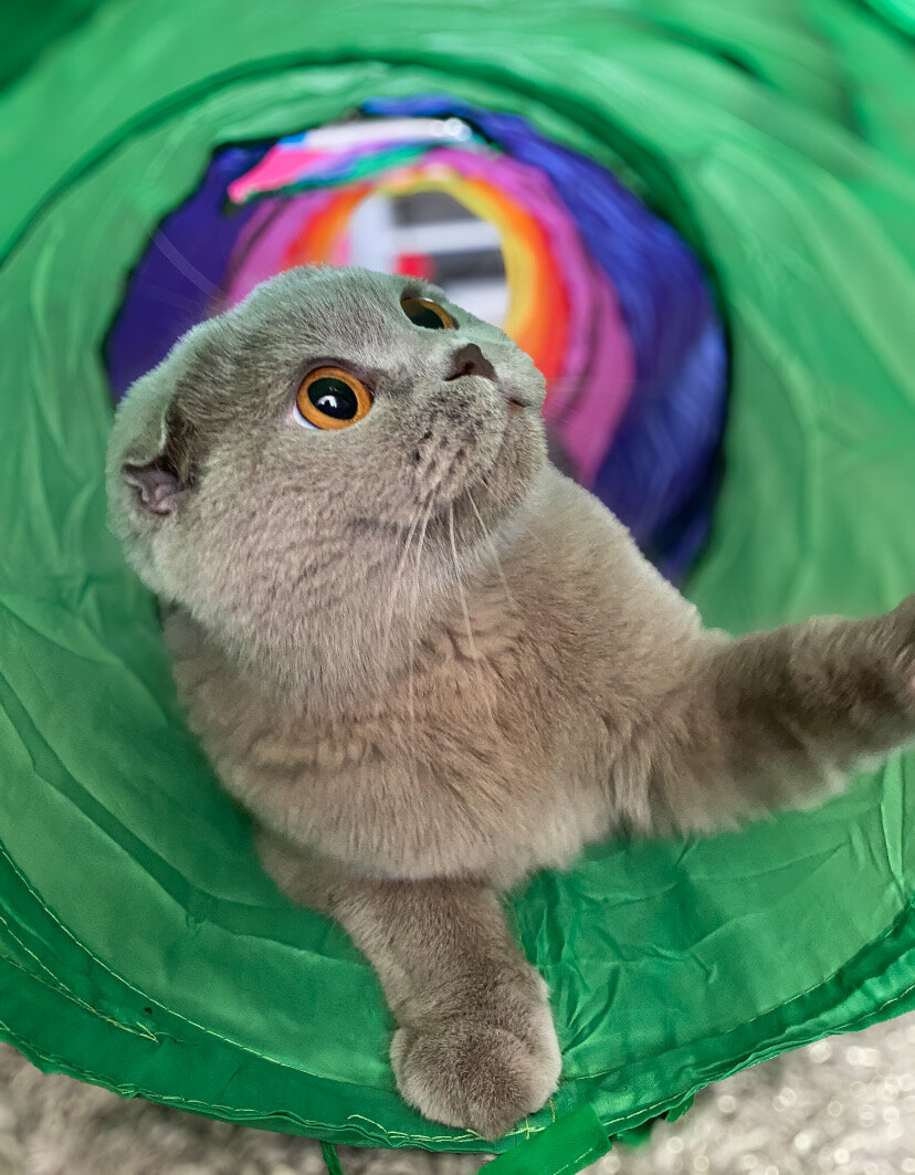 "Туннель используется 8 месяцев двумя кошками и мопсом 10 кг - деформации нет, швы целые несмотря на ежедневные игры. После 5 стирок шуршит как новый!" (Марина, Москва)