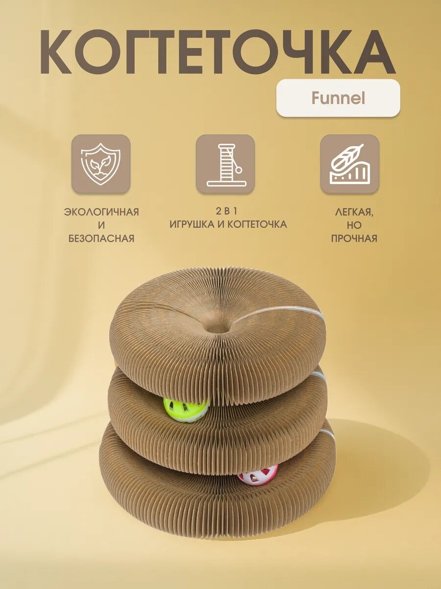 Когтеточка "Не Один Дома" Funnel объединяет две функциональные зоны: волнообразную поверхность для горизонтального стачивания когтей и вертикальный столбик для естественного вытяжения. Прессованный картон плотностью 600 г/м² обеспечивает устойчивость конструкции при весе кошки до 7 кг. Размеры 17х7х9,5 см позволяют разместить её: