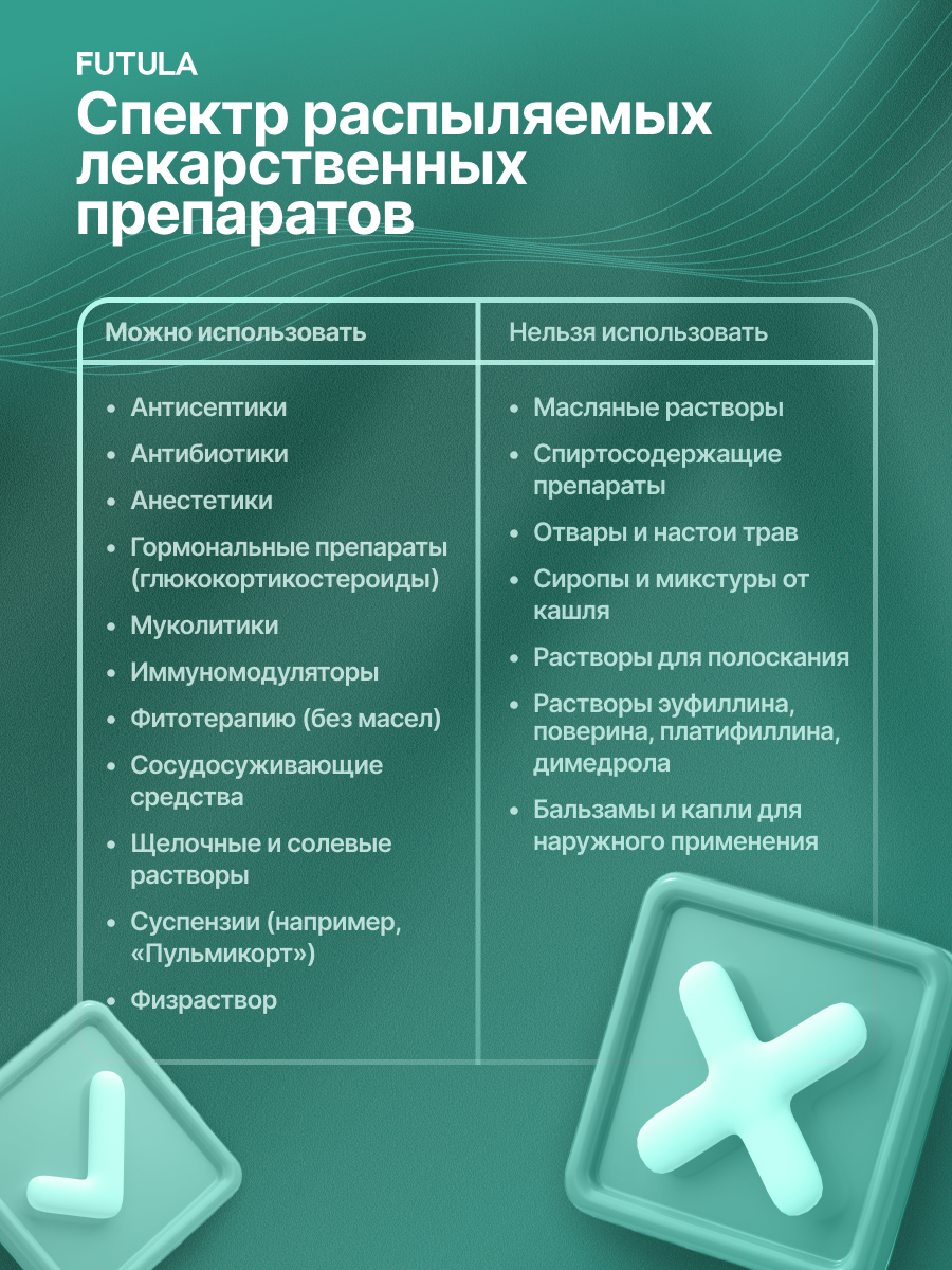 | Объем резервуара | 8 мл | Позволяет использовать полные дозы муколитиков |