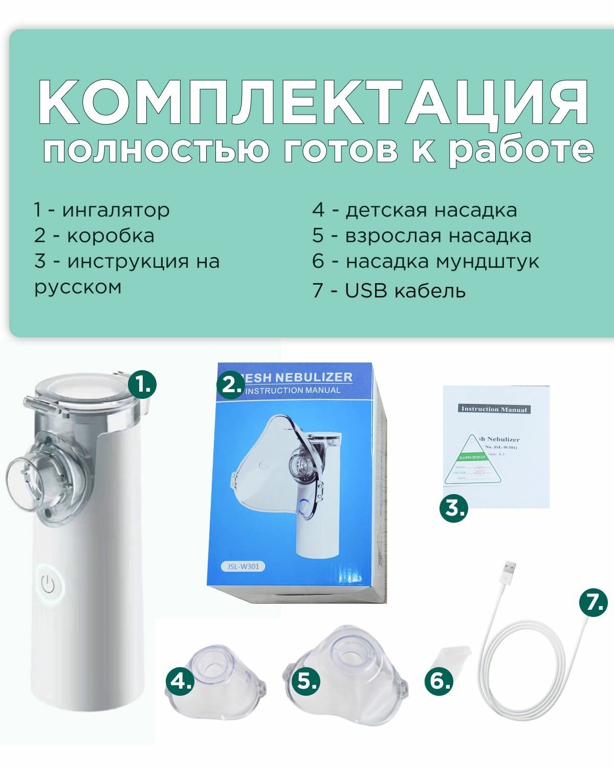 - Базовый набор: корпус ингалятора, 3 насадки (детская/взрослая/назальная), USB-C кабель, инструкция, сертификат