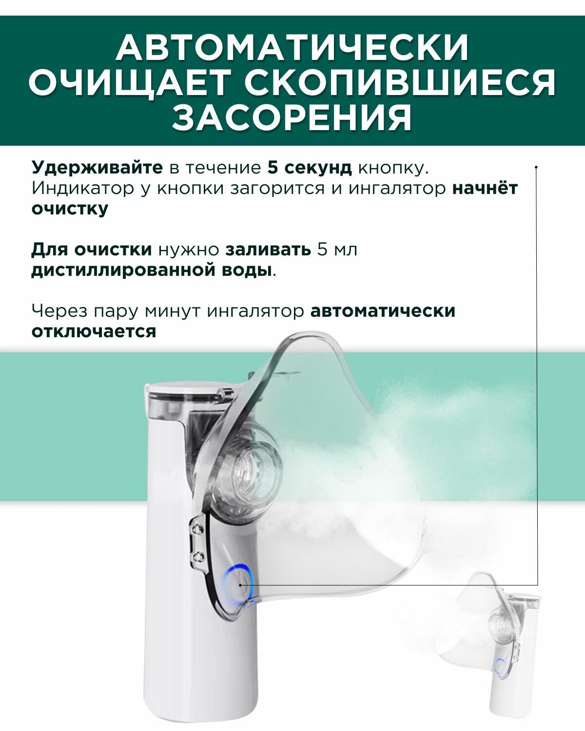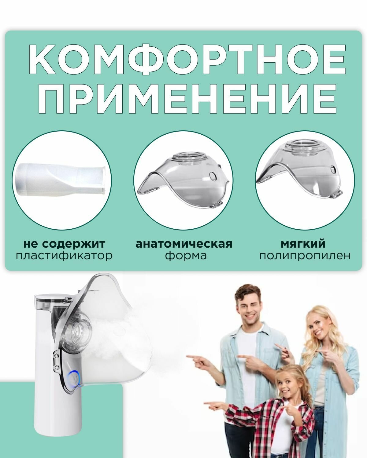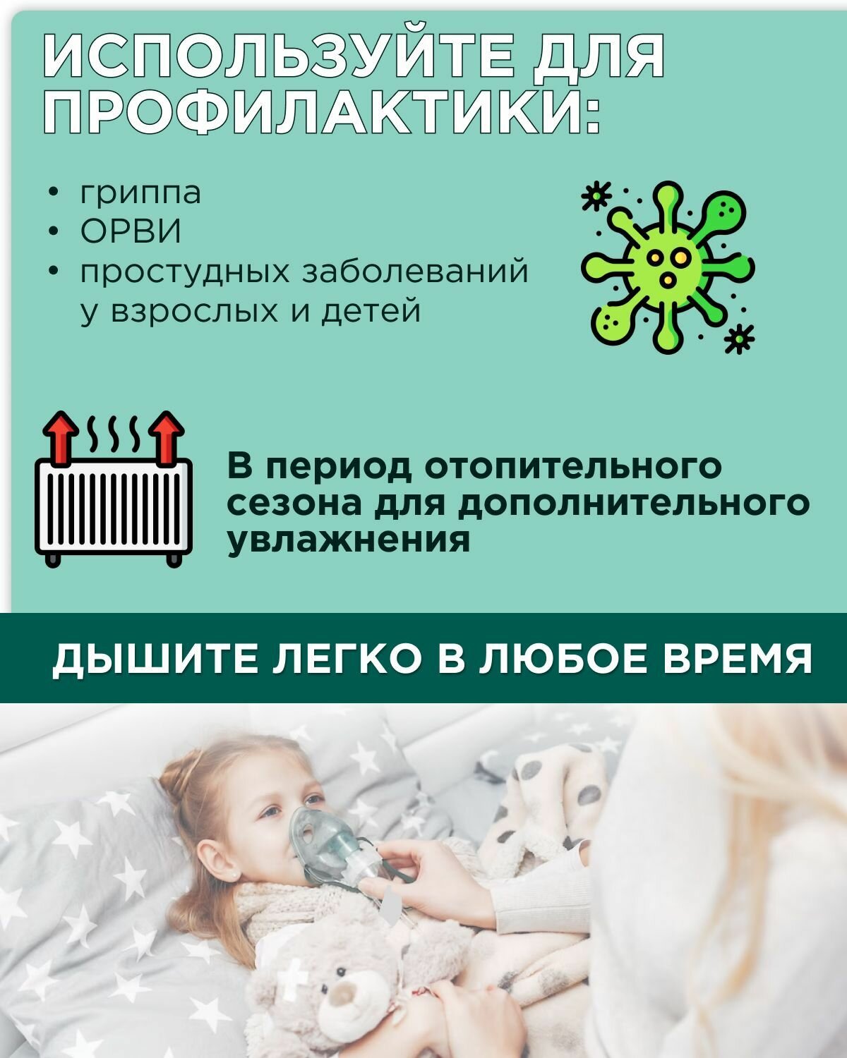 - 3 медицинских насадки в комплекте: детская маска (до 5 лет), взрослая маска (16+), назальный колпачок для лечения ринитов и синуситов — решение для всех членов семьи.